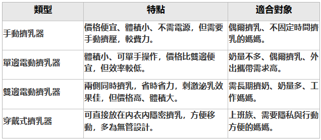 手動擠乳器:用手壓泵產生吸力,適合偶爾使用。