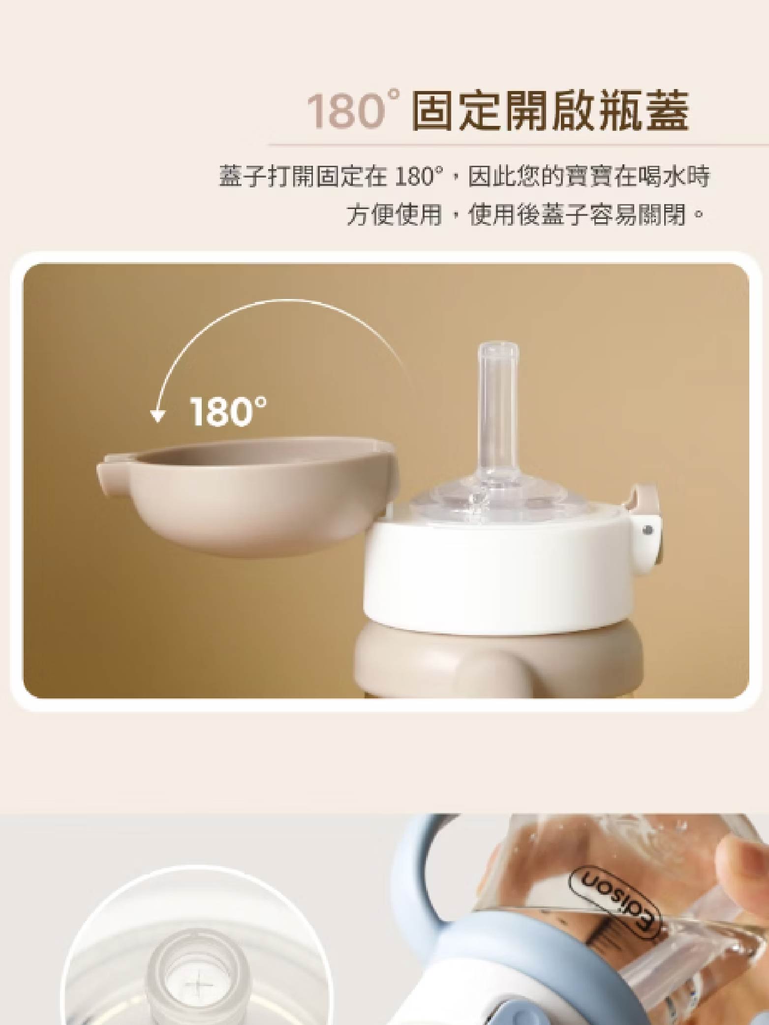 ●一鍵式彈蓋設計,蓋子打開固定在180度,寶寶喝水不卡卡