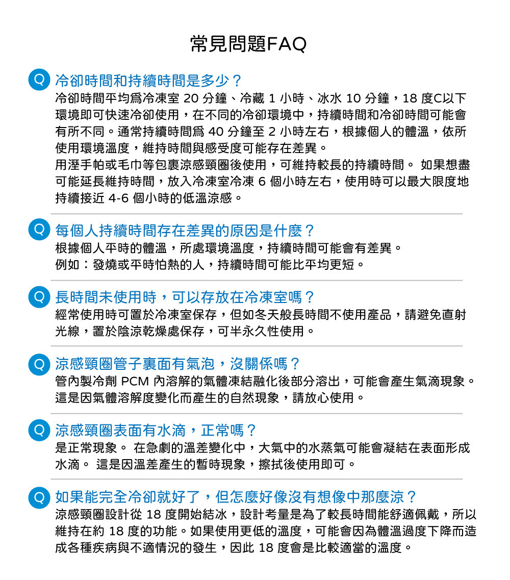 涼感頸圈設計從18度開始結冰,設計考量是為了較長時間能舒適佩戴,所以維持在約18度的功能。 如果使用更低的溫度,可能會因為體溫過度下降而造成各種疾病與不適情況的發生,因此18度會是比較適當的溫度。