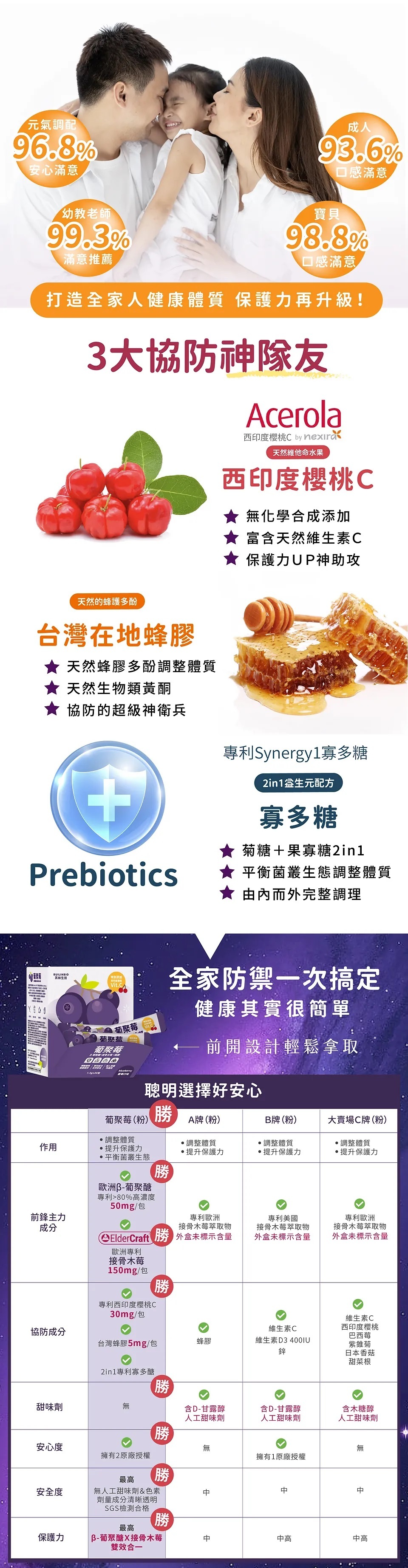 即溶藍莓果汁粉(砂糖、麥芽糊精、藍莓濃縮汁、檸檬酸、檸檬酸鈉、香料、葡萄皮色素、梔子藍色素)、日本專利玉米來源可溶性纖維、專利比利時寡多糖(菊苣纖維)、專利歐洲接骨木莓萃取物(接骨木莓、麥芽糊精)、專利酵母β-葡聚醣、西印度櫻桃萃取粉(含維生素C)(西印度櫻桃萃取物、麥芽糊精)、蜂膠萃取物(乳糖、柑橘生物類黃酮、蜂膠萃取液)