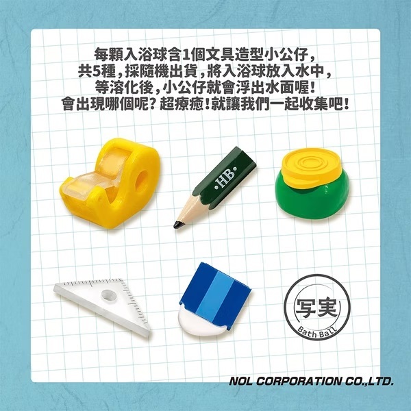 每顆入浴球含1個文具造型小公仔,共5種,採隨機出貨,