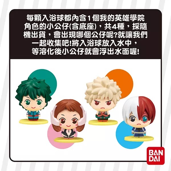 每顆入浴球都內含1個我的英雄學院角色的小公仔(含底座),共4種, 採隨機出貨,