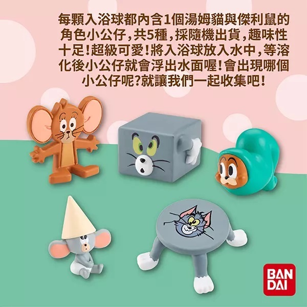 每顆入浴球都內含1個湯姆貓與傑利鼠的角色小公仔, 共5種,採隨機出貨,