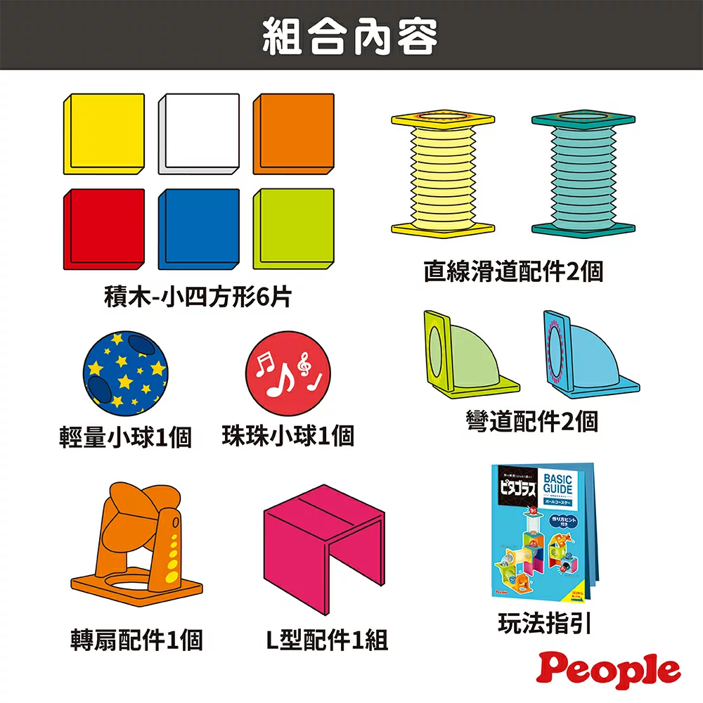 1.積木-小四方形6片、2.直線滑道配件2個、3.輕量小球(直徑約4.3cm)1個、4.珠珠小球1個、