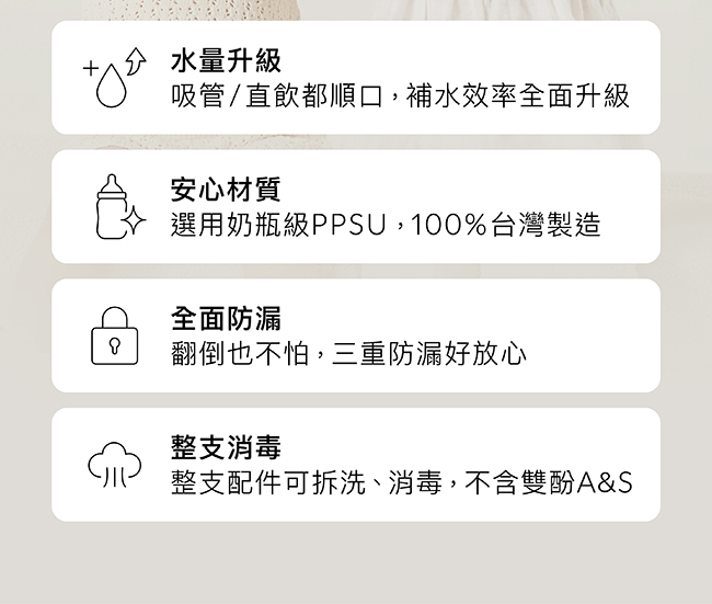 選用奶瓶級PPSU材質,喝出高規格品質。