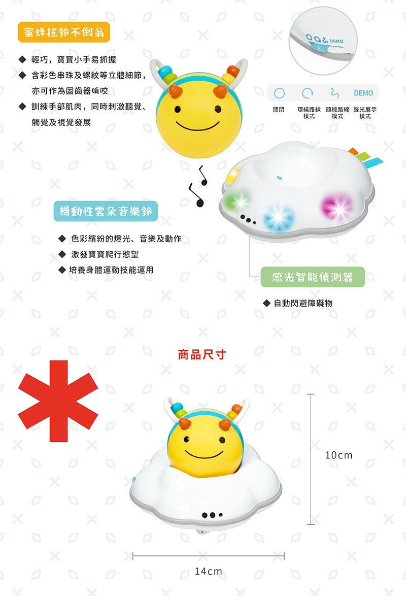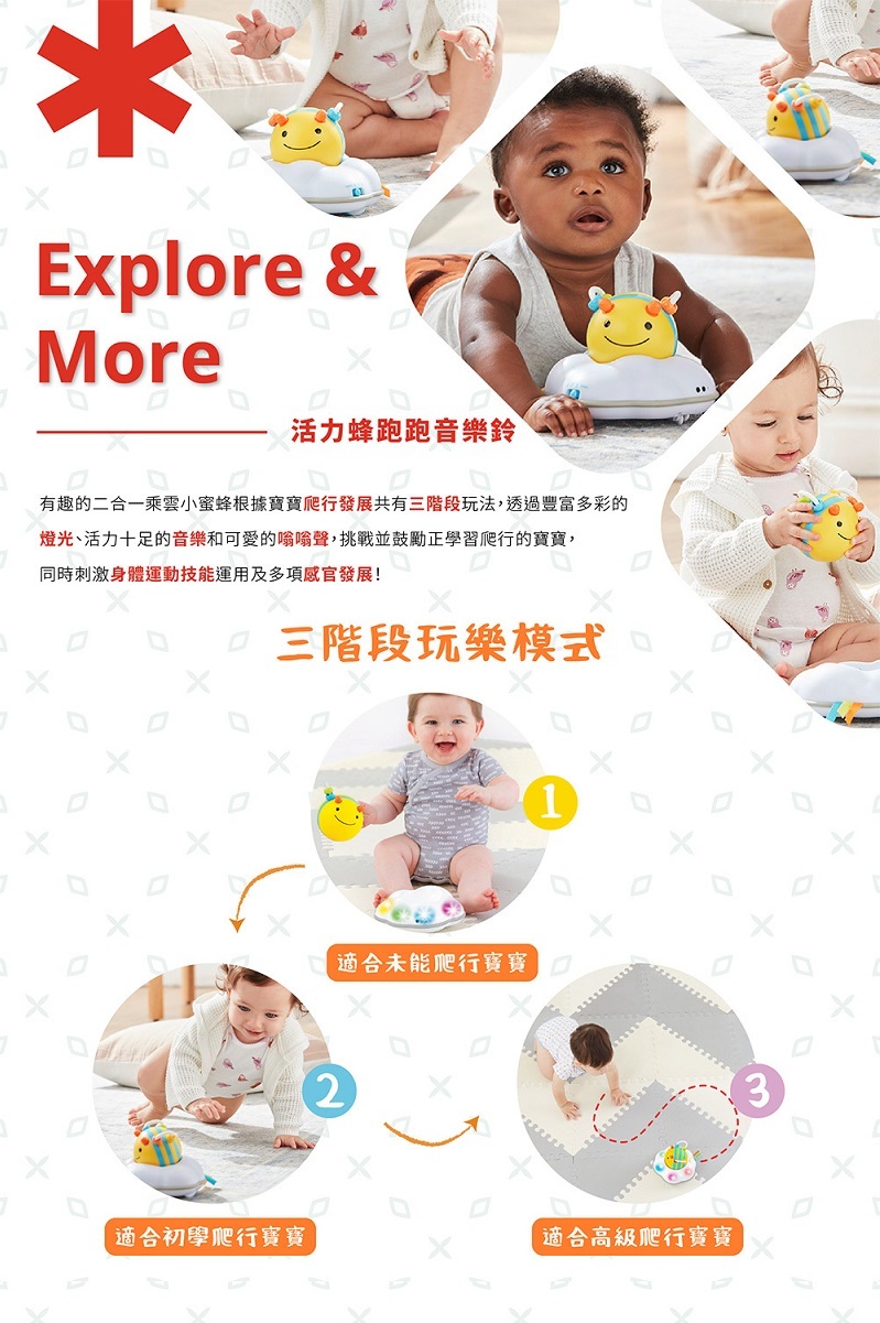 透過豐富多彩的燈光、活力十足的音樂和可愛的嗡嗡聲,挑戰並鼓勵正學習爬行的寶寶,同時刺激身體運動技能及感官發展!