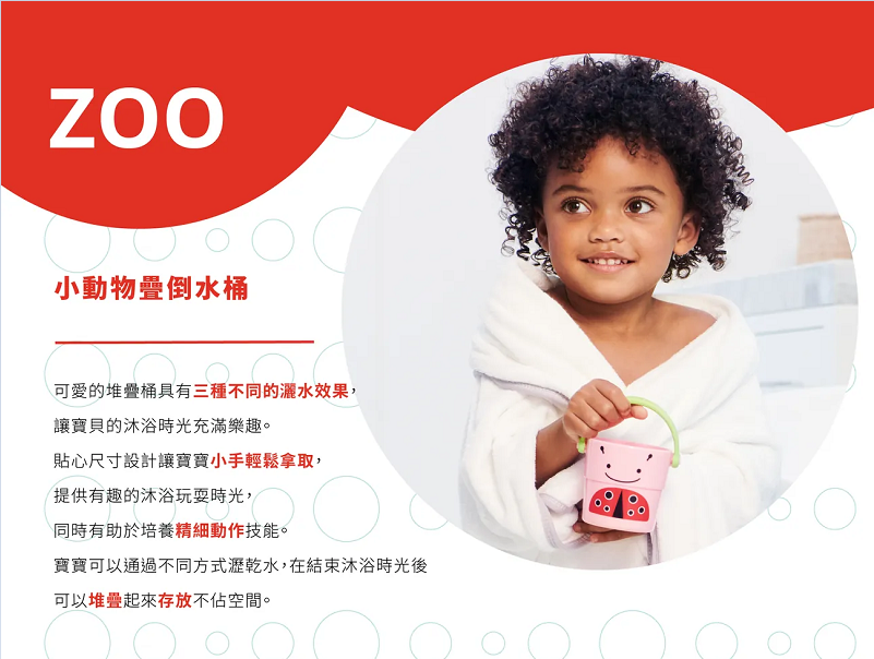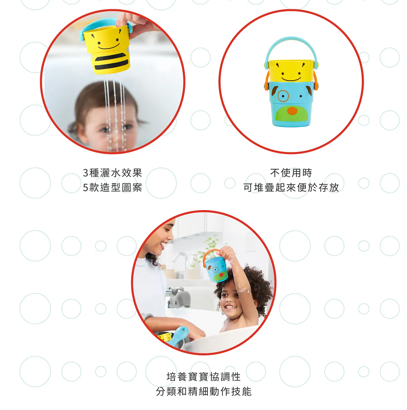 可愛的堆疊桶具有三種不同的灑水效果,讓寶貝的沐浴時光充滿樂趣。貼心尺寸設計讓寶寶小手輕鬆拿取,提供有趣的沐浴玩耍時光,同時有助於培養精細動作技能。 寶寶可以通過不同方式瀝乾水,在結束沐浴時光後可以堆疊起來存放不佔空間。