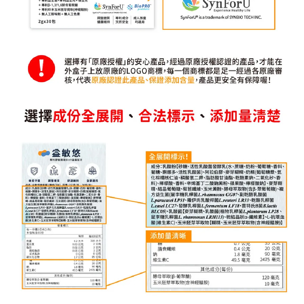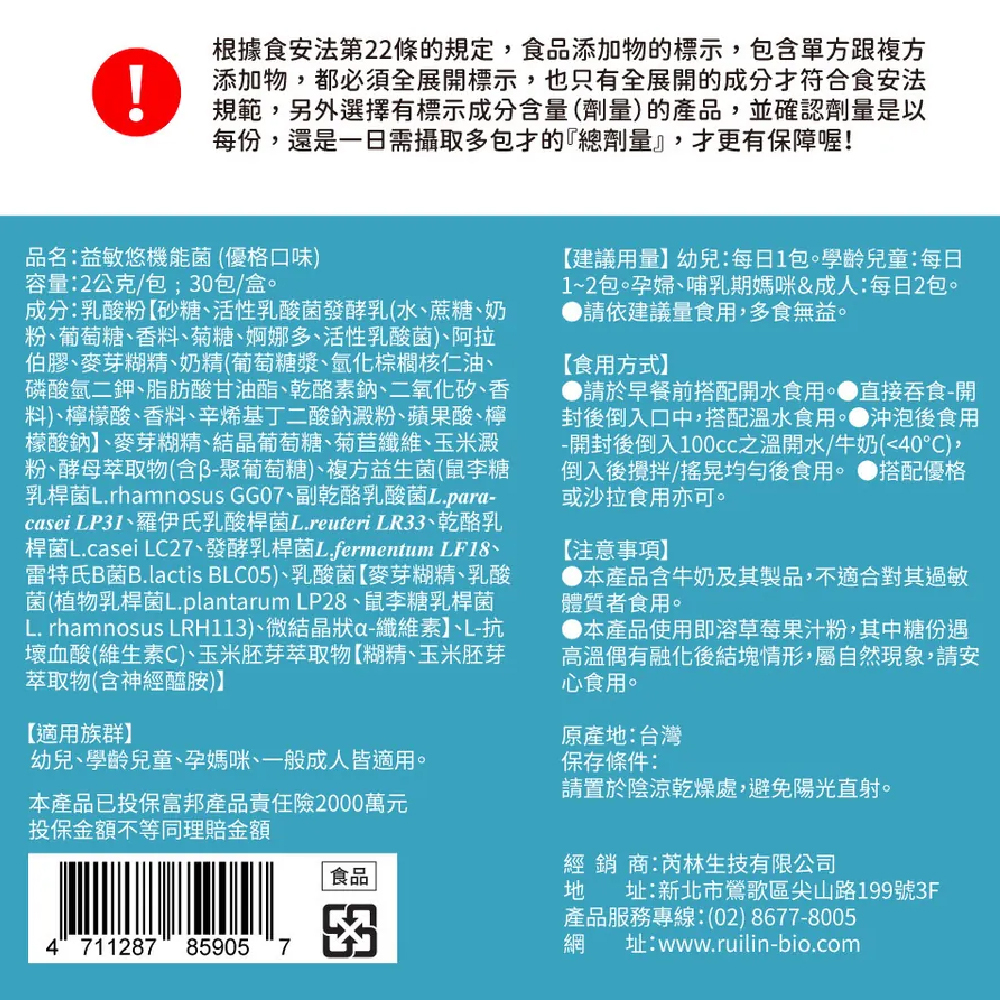 品名:益敏悠機能菌(優格口味) 容量:2公克/包;30包/盒。