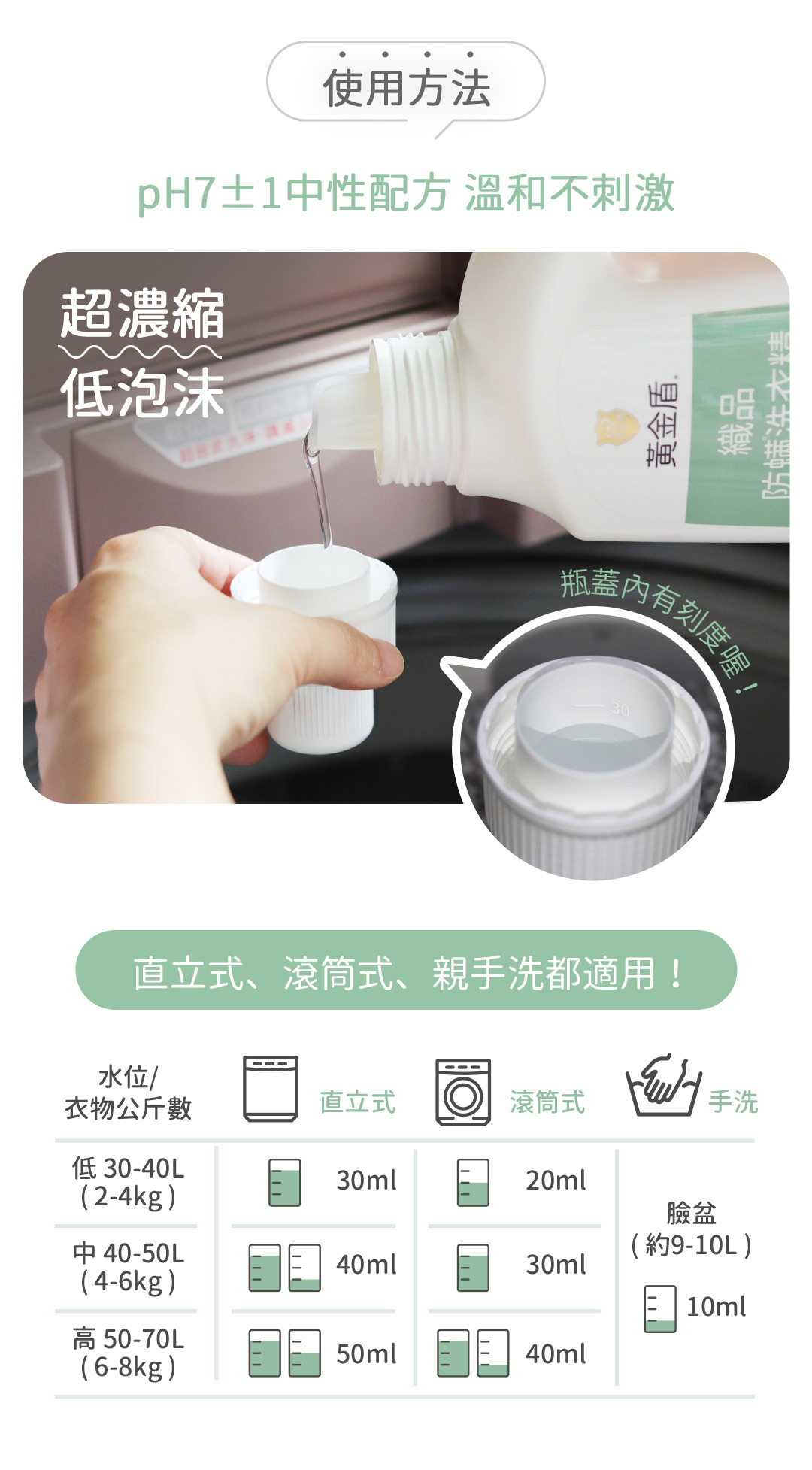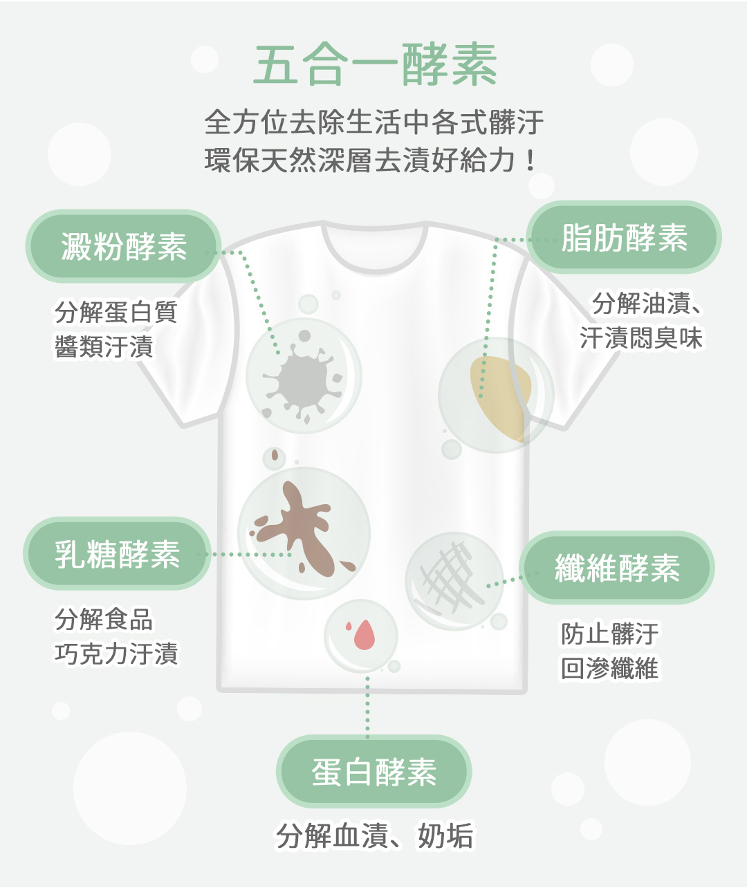✔添加五合一酵素,全方位去除油漬、汗漬、食品汙漬等