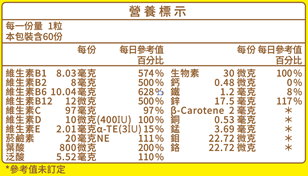 成份:葡萄糖酸鋅、維生素C(L-抗壞血酸、羥丙基甲基纖維素)、麥芽糊精、葡萄糖酸錳、菸鹼醯胺、玉米來源可溶性纖維、 DHA藻油粉(DHA藻油、葡萄糖漿、D-甘露醇、乾酪素鈉、大豆蛋白、葵花油、抗壞血酸鈉(維生素C)、天然香料、磷酸鈣、焦磷酸鈉、混合濃縮生育醇(抗氧化劑)、大豆卵磷脂、L-抗壞血酸棕櫚酸酯(抗氧化劑))、維生素B6、鉻酵母、鉬酵母(啤酒酵母、鉬酸鈉)、維生素B1、葡萄糖酸亞鐵、維生素B2、維生素E(乙酸dl-α-生育醇酯、辛烯基丁二酸鈉澱粉、麥芽糊精、二氧化矽)、本多酸鈣、螺旋藻粉、 硬脂酸鎂(食用級)、二氧化矽、維生素D3(辛烯基丁二酸鈉澱粉、蔗糖、抗壞血酸鈉、中鏈三酸甘油酯、二氧化矽、DL-α-生育醇、維生素D3)、葡萄糖酸銅、牛初乳粉(含乳鐵蛋白)(牛初乳、中鏈三酸甘油酯、卵磷脂)、葡萄萃取物(含白藜蘆醇)、β-胡蘿蔔素(葡萄糖漿、辛烯基丁二酸鈉澱粉、中鏈三酸甘油酯、抗壞血酸鈉(抗氧化劑)、水、β-胡蘿蔔素、生育醇(抗氧化劑)、磷酸鈣)、接骨木萃取物(接骨木萃取物、麥芽糊精)、 金盞花萃取物(金盞花萃取物、麥芽糊精)、番茄萃取物(番茄萃取物、β-環狀糊精)、葉酸、生物素、維生素B12。