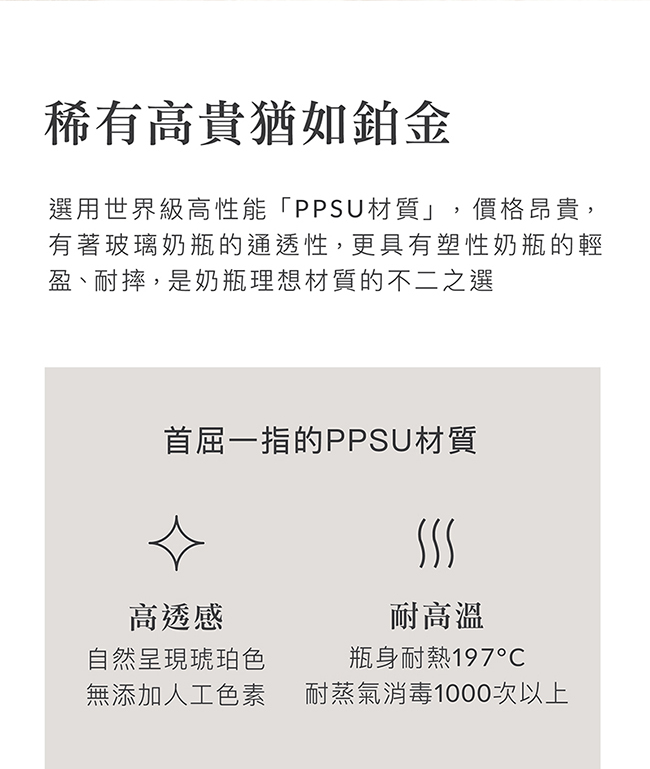 材質:•奶瓶蓋、中蓋:聚丙烯(-20℃~ 100℃)•奶瓶:聚亞苯基碸(-20℃~ 197℃)•防脹氣奶嘴:矽膠(-40℃~ 150℃)