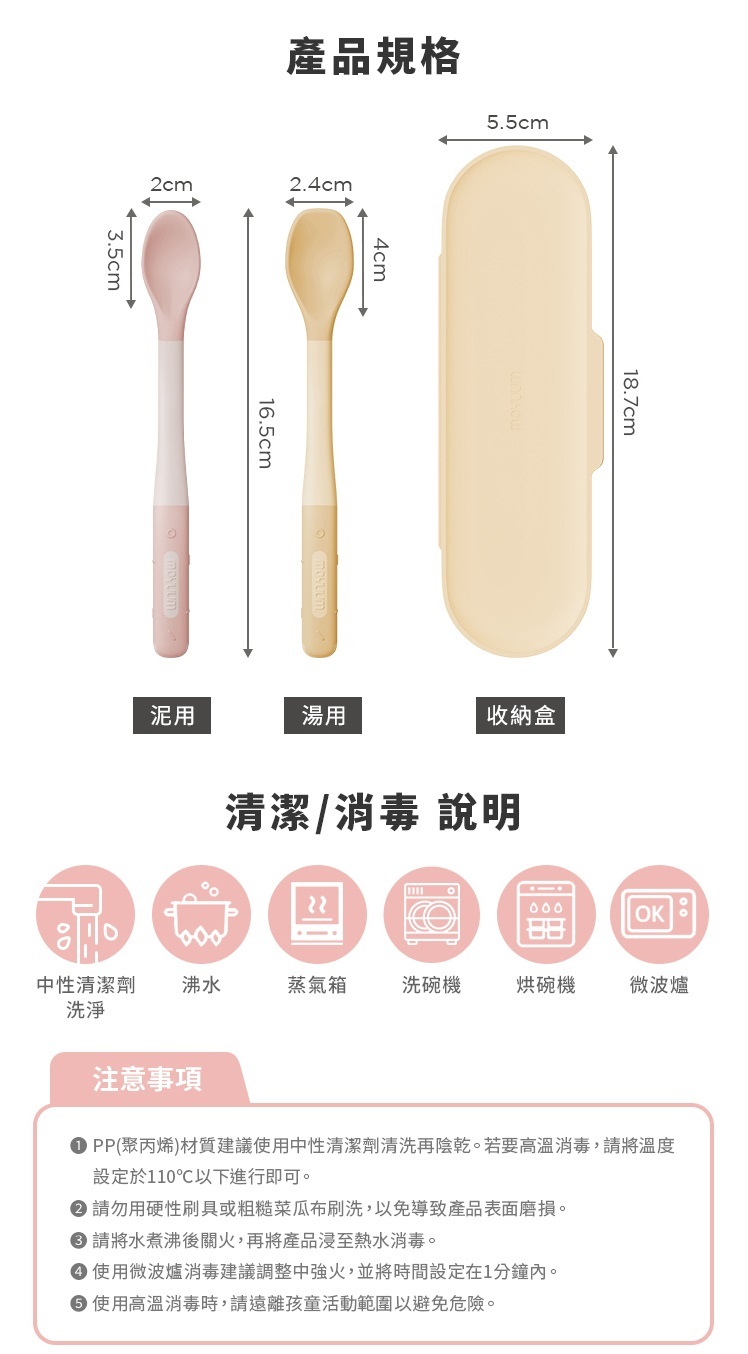 材質:湯匙(TPE+PP/-20℃~110℃)、收納盒(PP/-20℃~110℃)
