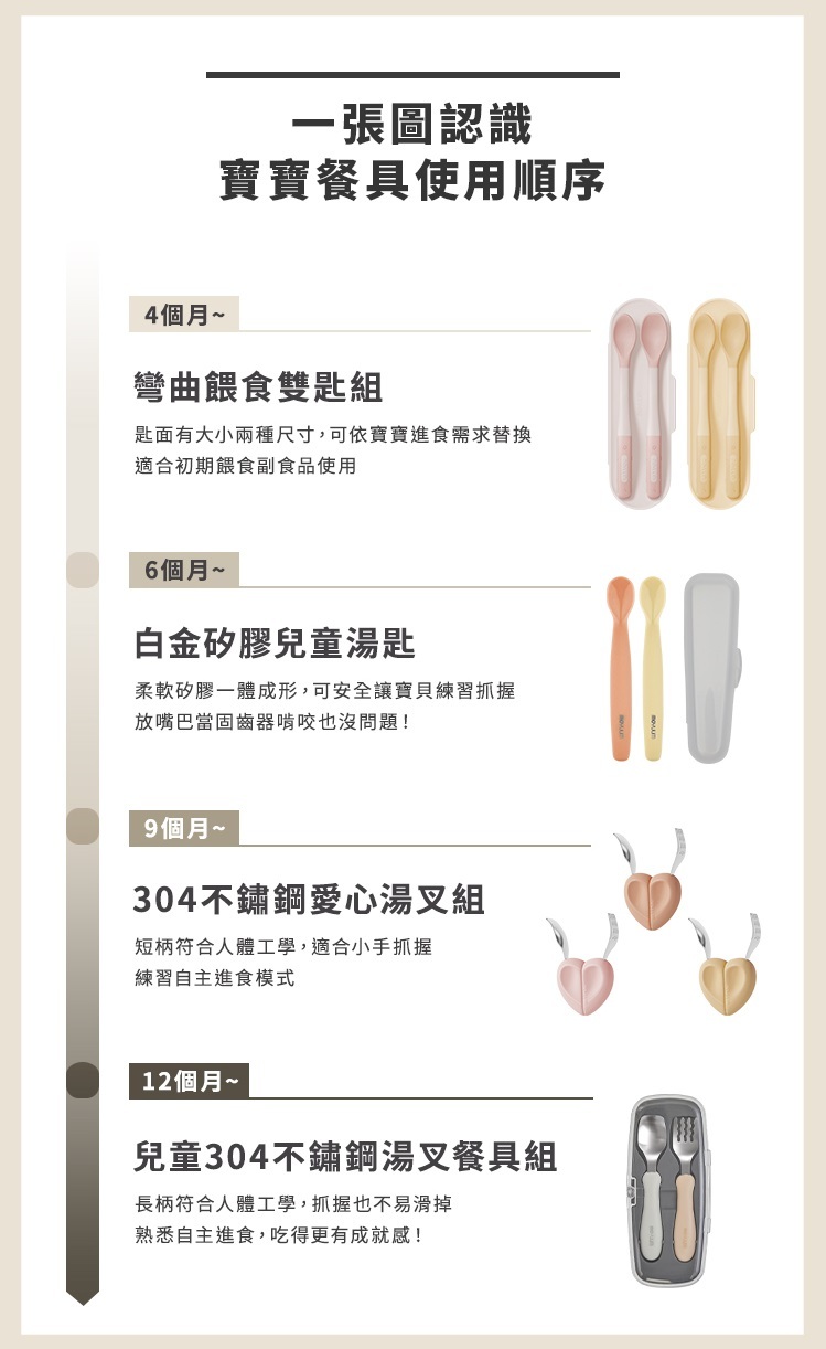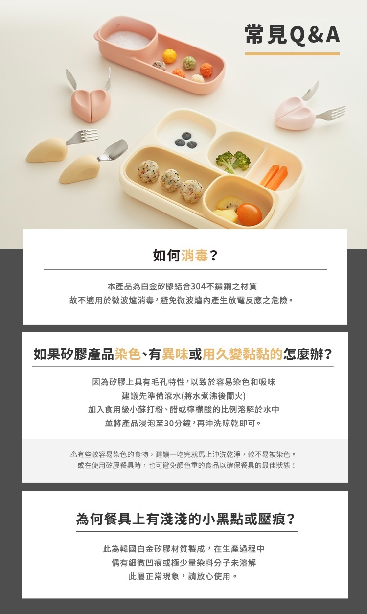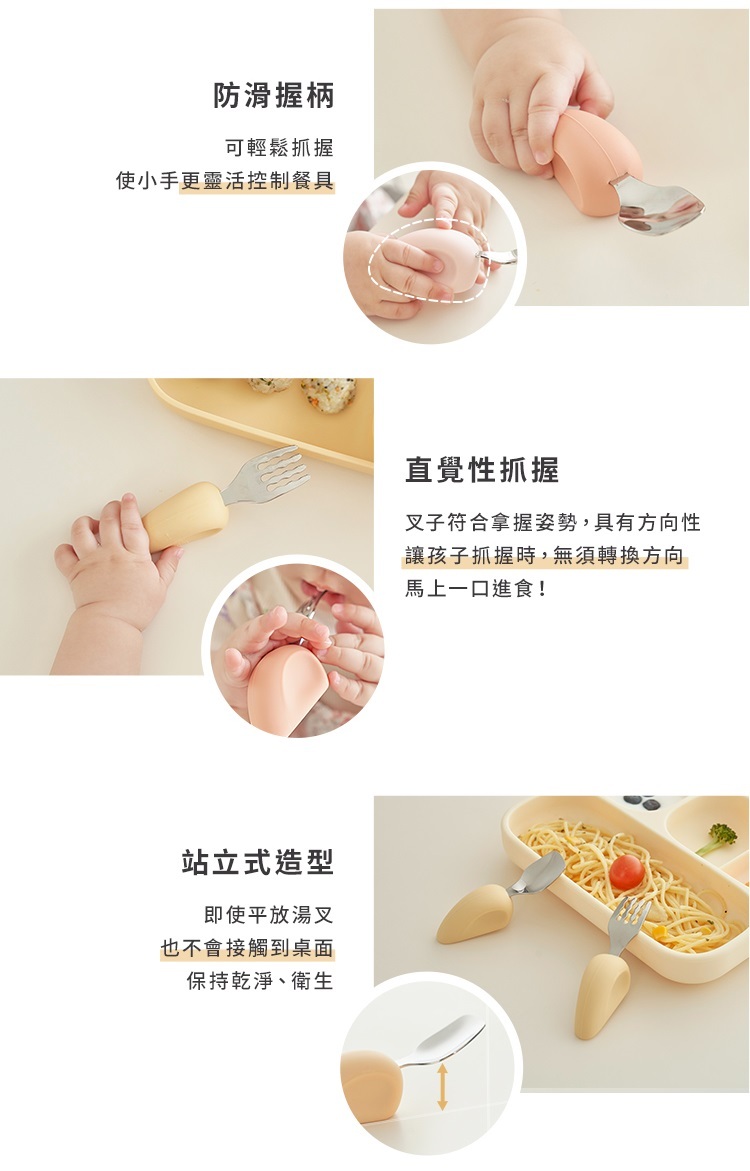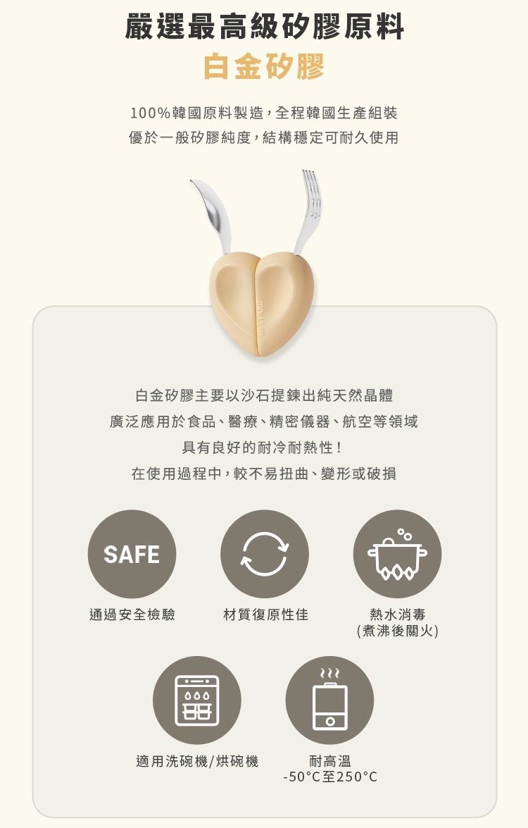 材質:【湯匙/叉子】304不鏽鋼、【握柄】白金矽膠(-50℃~250℃)