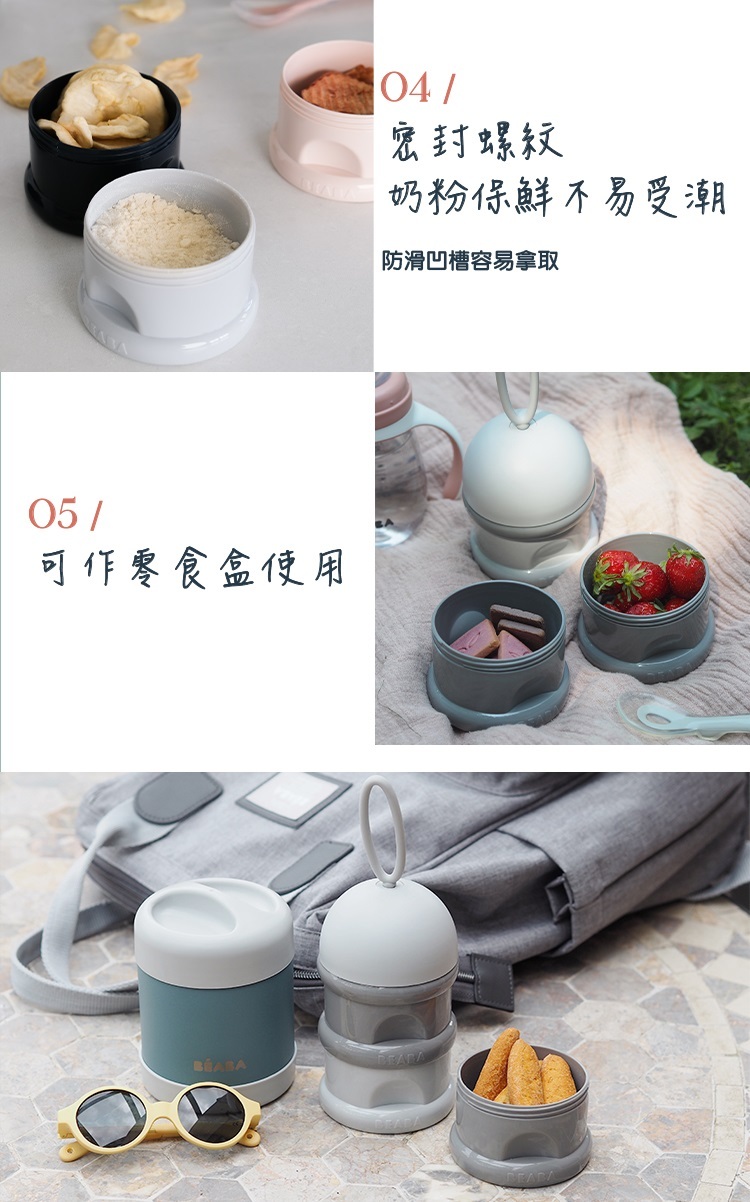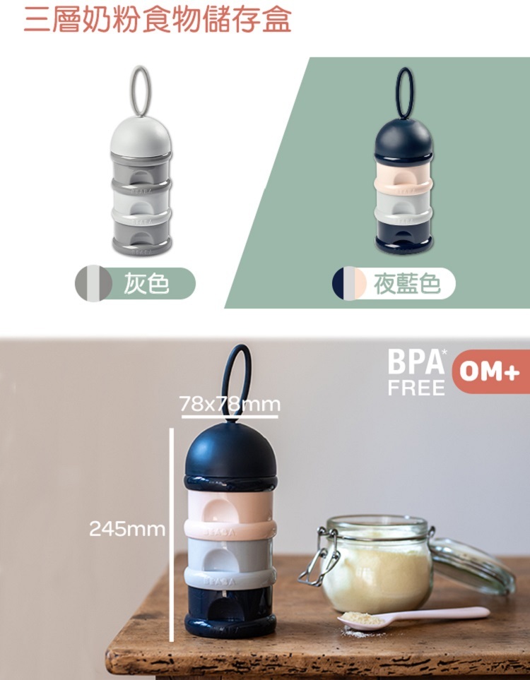 直立式獨立三層設計,單層最大容量約115g。附提把輕巧攜帶方便易於收納。漏斗形口徑,沖泡不灑出不易卡粉。密封螺紋奶粉保鮮不易受潮,防滑凹槽容易拿取。可作零食盒使用。