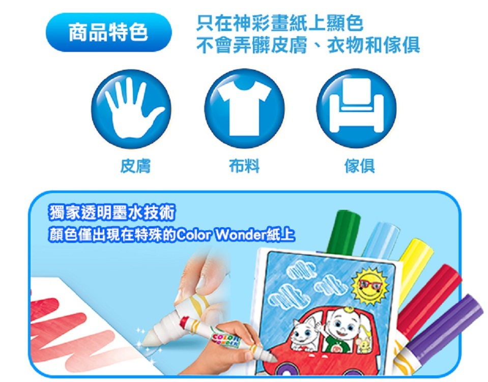 神彩色筆只在神彩畫紙上顯現亮麗色彩,不會沾染其他物體表面,隨便塗不會髒