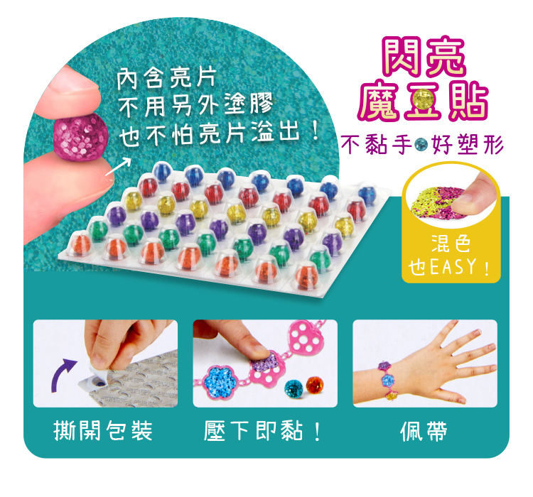 使用方法:打開閃亮魔豆包裝取適量,可將造型模板放置於貼紙上進行創做或是要將閃亮魔豆貼直接黏著物體表面;也適用於其他美術創作或是DIY手作