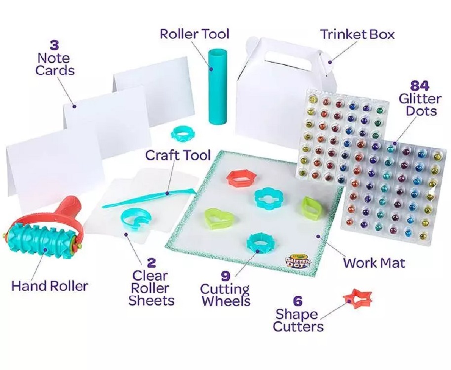 內容物:84顆閃亮魔豆貼、3張卡片、1支滾輪、1支手桿棍、9個裁切模型、6個造型模型、1只手提盒、2張清潔墊、1張工作墊