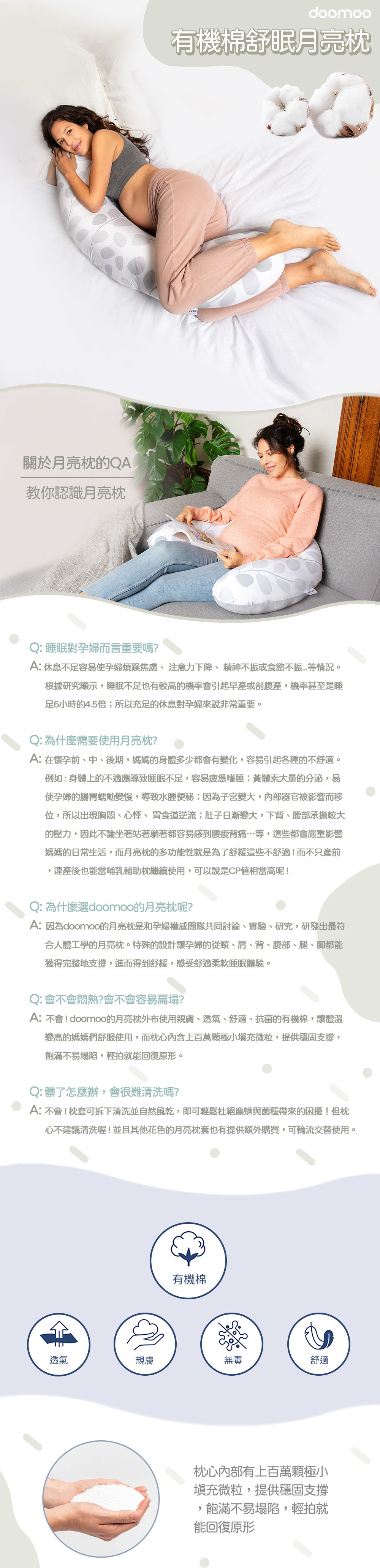 月亮枕柔軟舒適,可隨姿勢調整,輕拍回復原形,提供孕媽咪良好睡眠品質。