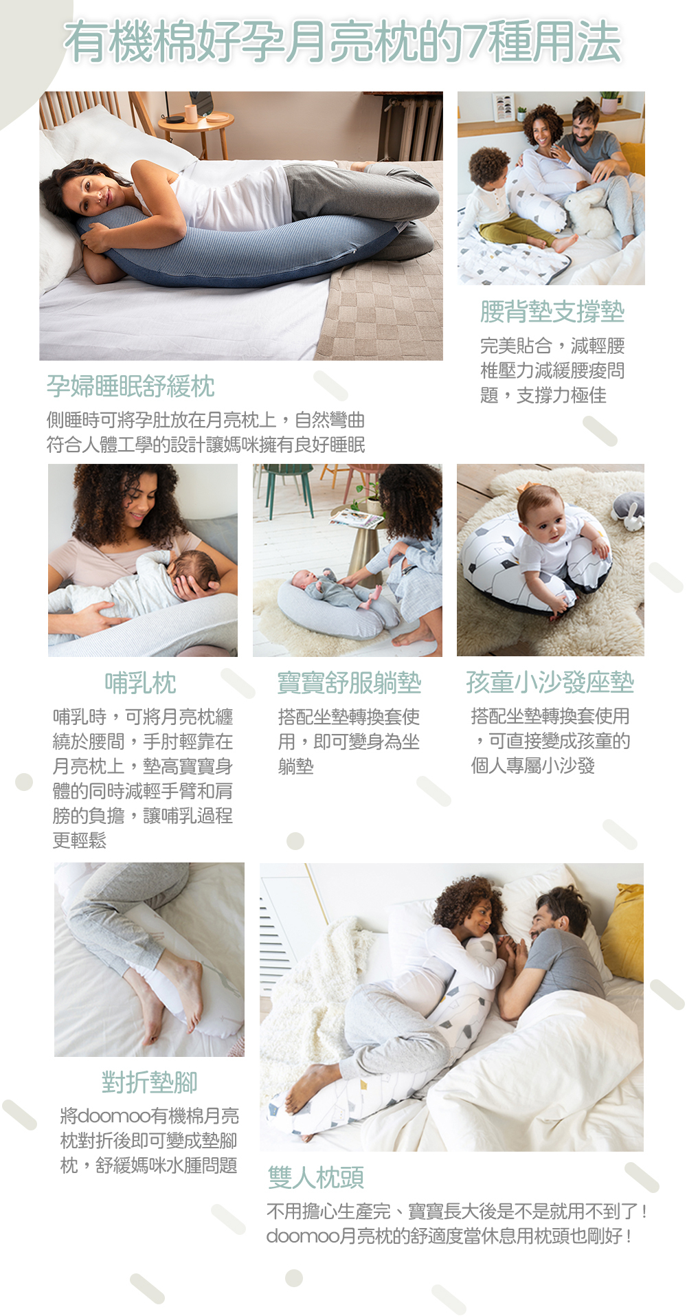 月亮枕可作為媽咪餵奶時的哺乳枕、孕婦睡眠舒緩枕、腰墊與寶寶坐躺枕,多功能靈活運用,寶貝用得開心、媽咪超安心。