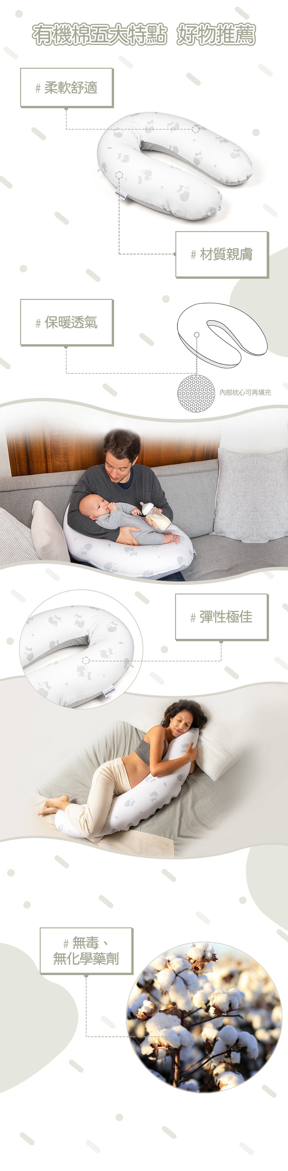 枕套為有機棉材質,不僅可機洗,還能自行更換與另外購買喜歡的花色,清潔方便好打理。