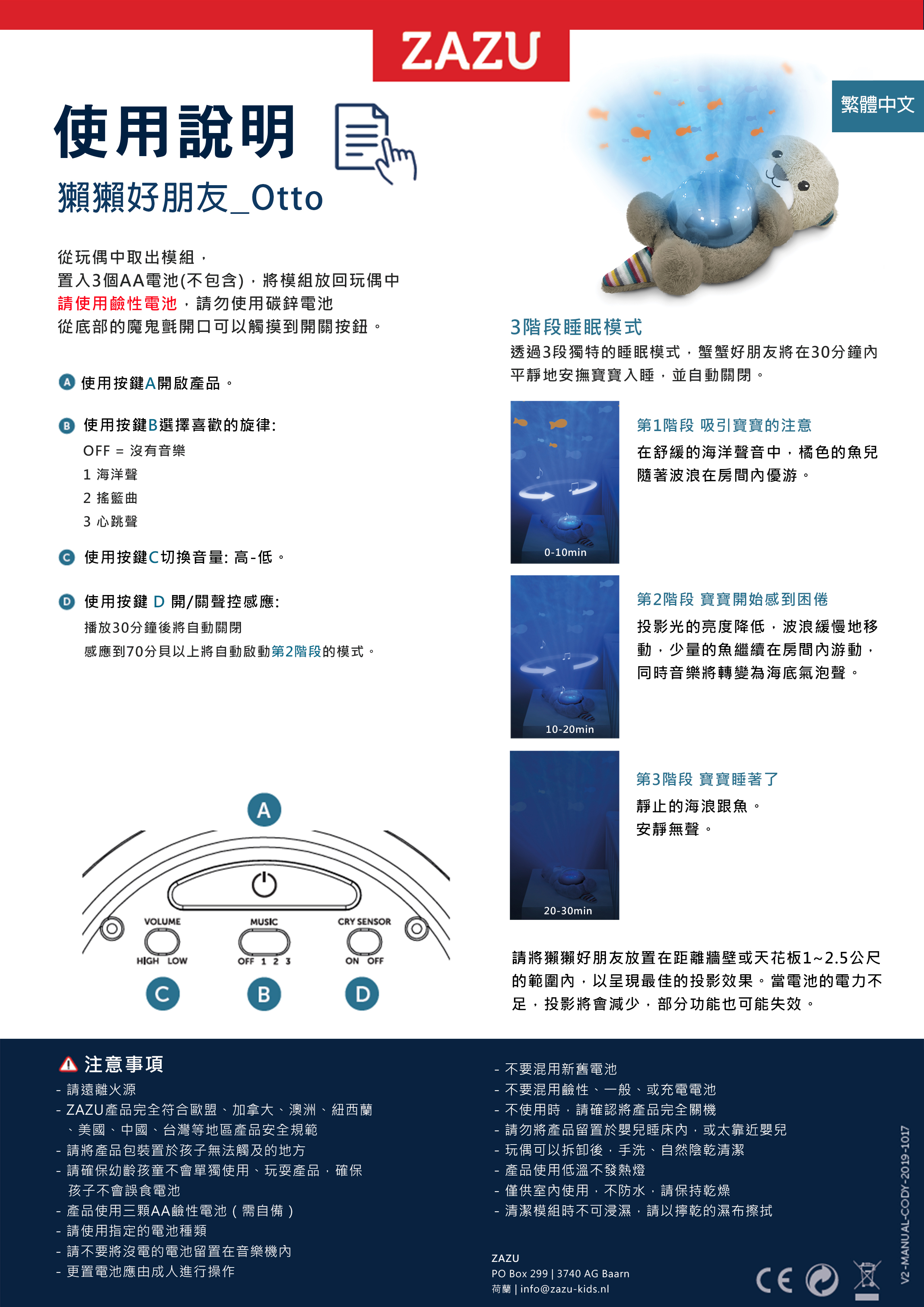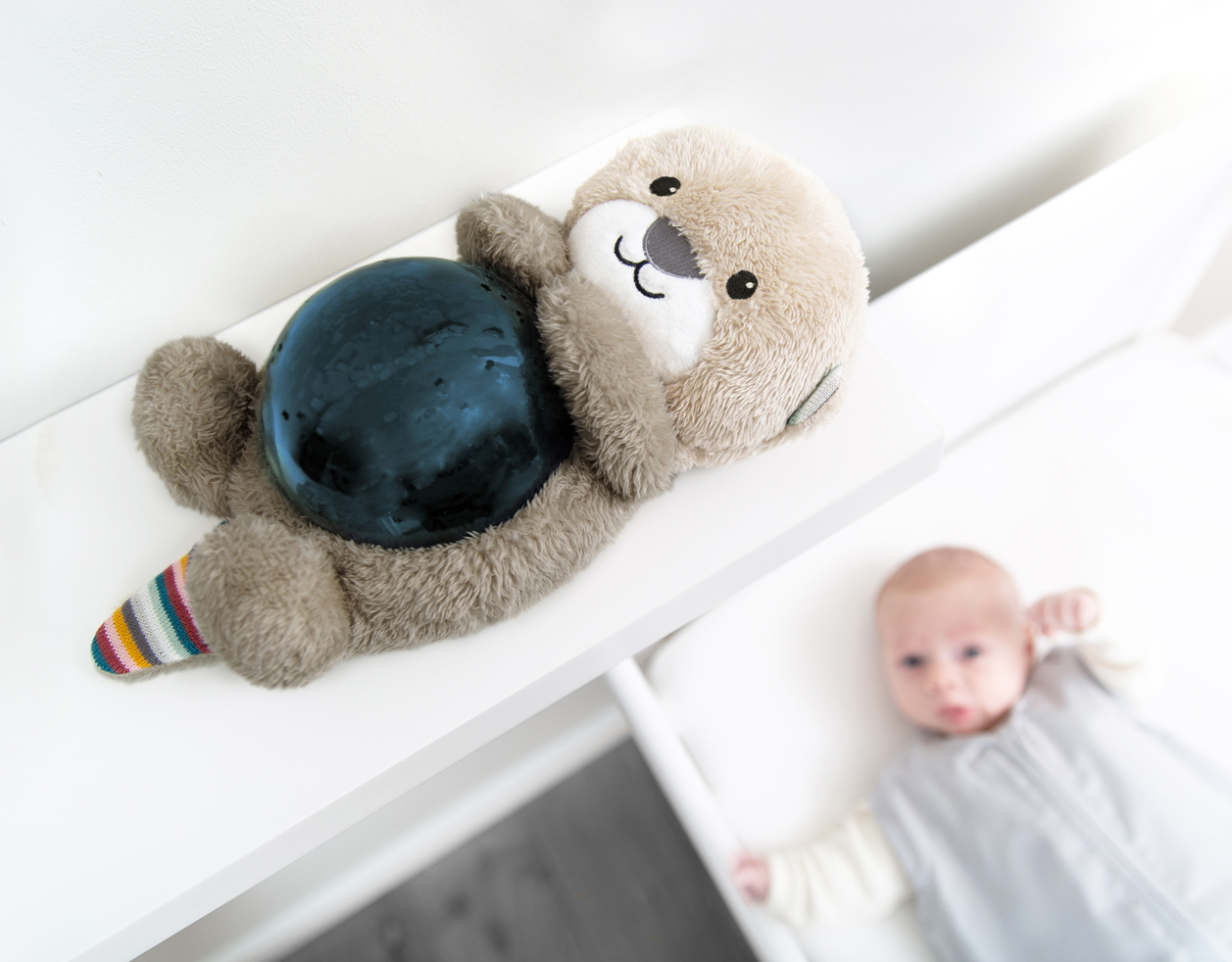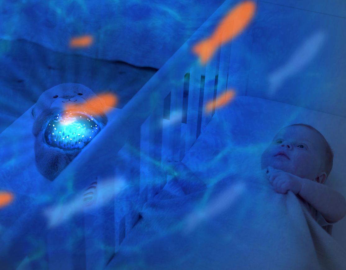 聲控感應的【獺獺好朋友】投影出遊動的魚兒及波浪,搭配舒緩的海洋音樂,搭配3階段睡眠模式讓寶寶慢慢進入夢鄉,30分鐘將會自動關閉,而感應到寶寶哭聲時又將自動開啟。