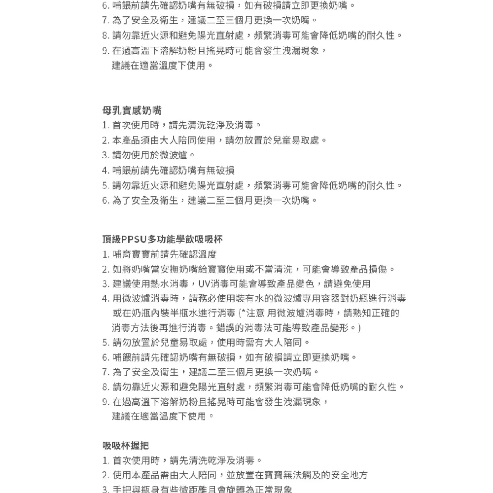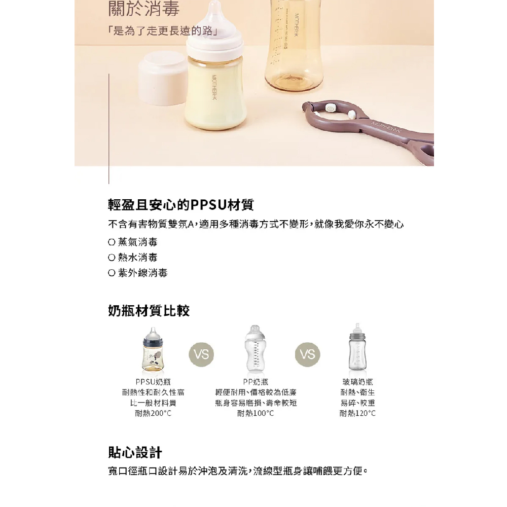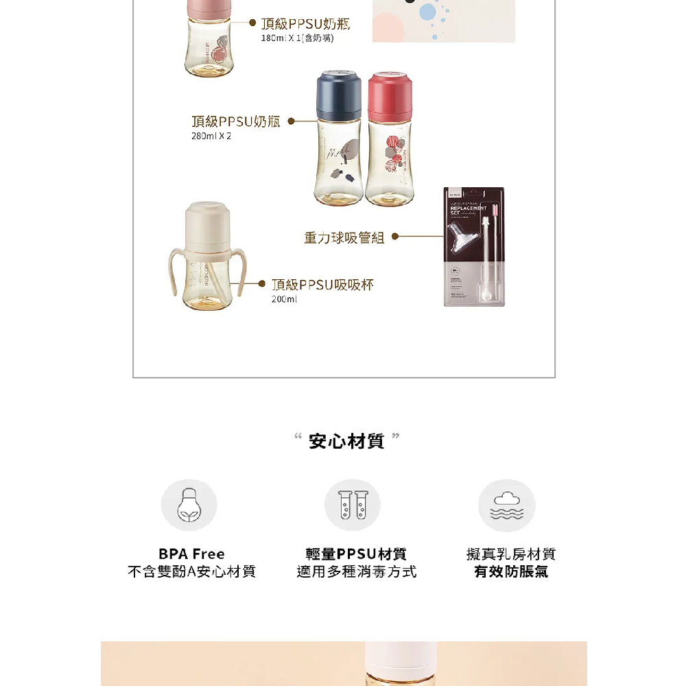 ●材質/耐温:瓶身-PPSU/200度·蓋子-PP/100度·奶嘴-矽膠/120度