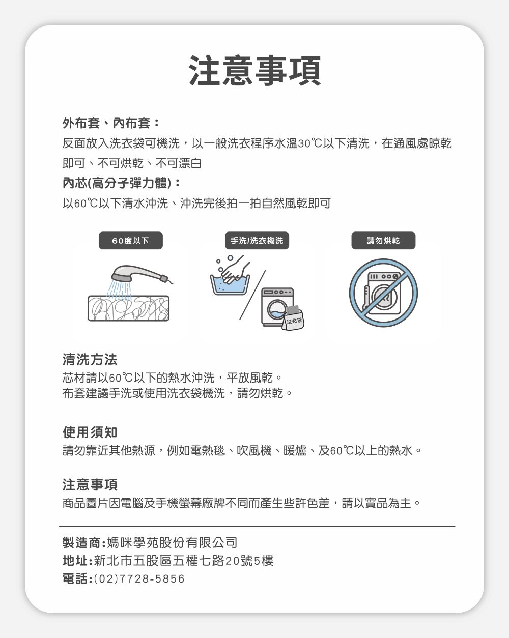 材質:內芯 高分子彈力體(100%聚烯煙彈性體)100%聚酯纖維、100純棉、內布套 66%聚酯纖維、34%純棉、外布套 科技恆溫緹花布