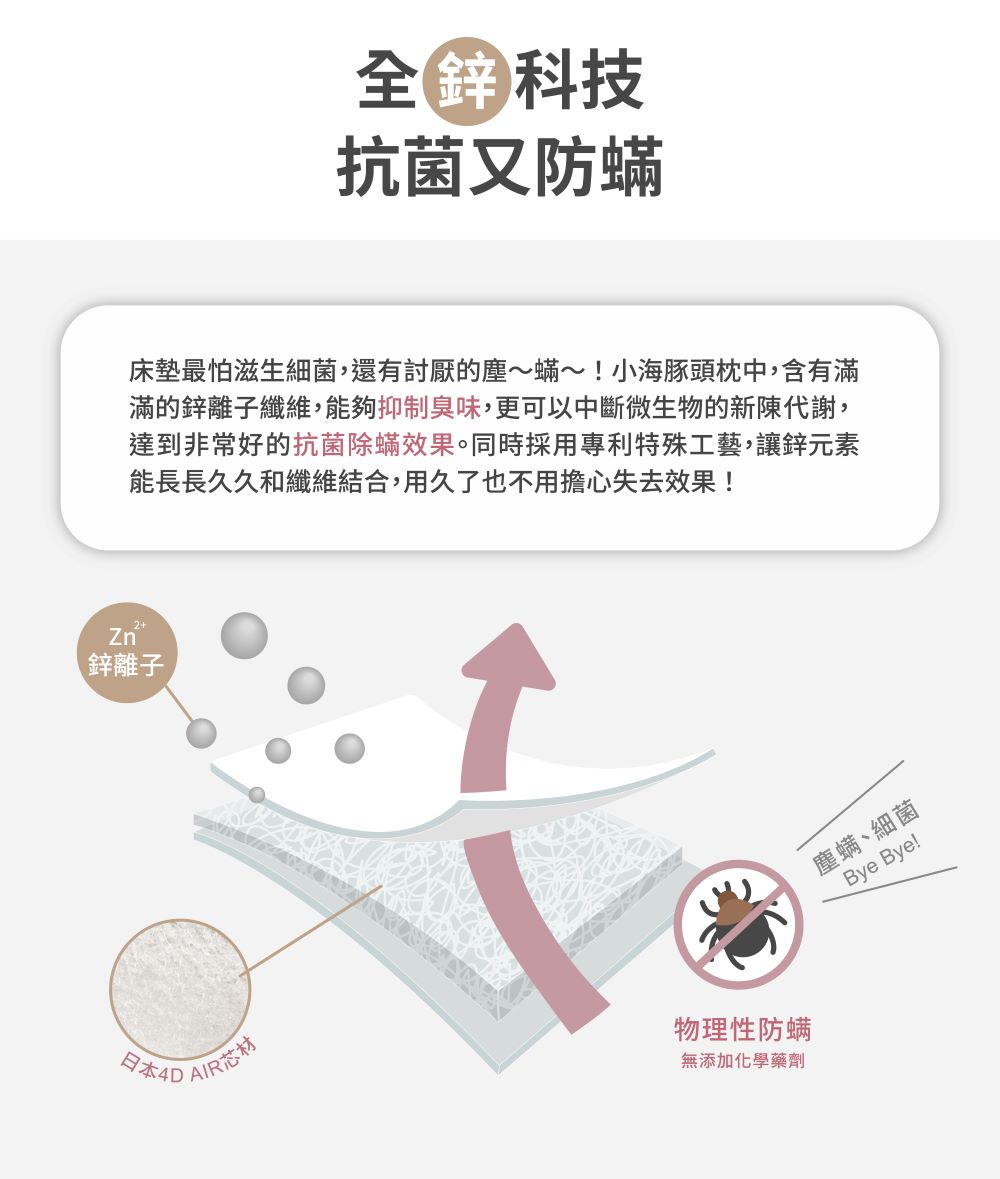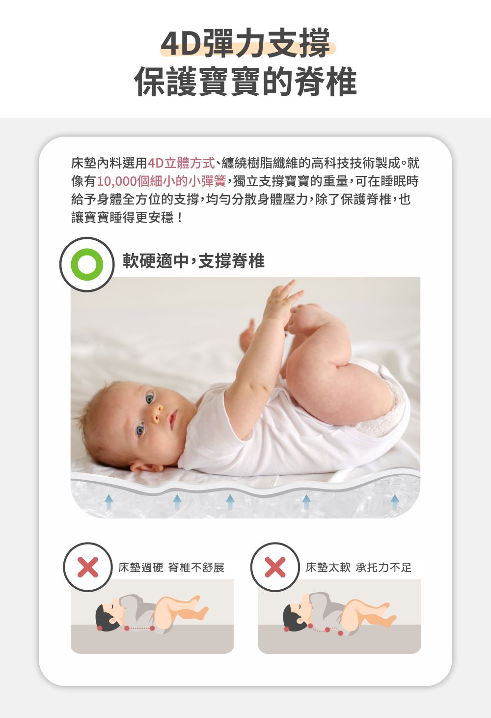 4D 彈力結構技術 : 高回彈材料、支撐有力!高復原高彈性,相當於 10000 個獨立小彈簧,支撐更有力!有效分散體壓,持續呵護寶寶脊椎