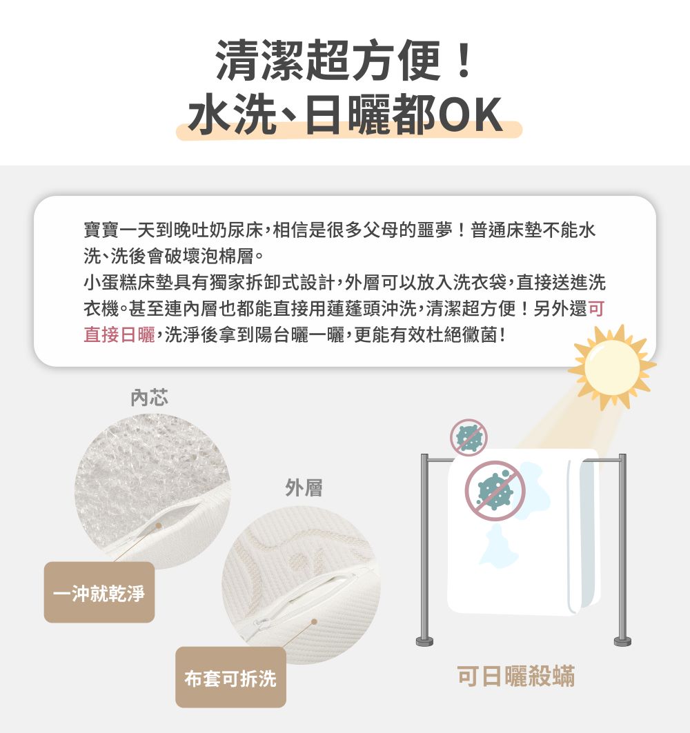 內芯輕鬆拆洗 : 可以水洗、日曬才是真的乾淨!輕輕鬆鬆蓮蓬頭一沖,髒污跟著走、吸收陽光杜絕黴菌!