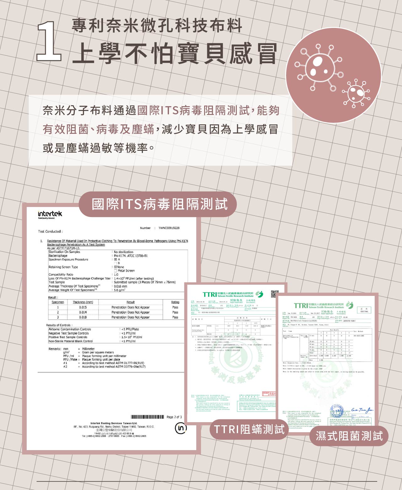 也使用經過國際ITS認證布料本身有阻菌阻病毒效果,減少小朋友因為上學感冒或是過敏的機率,