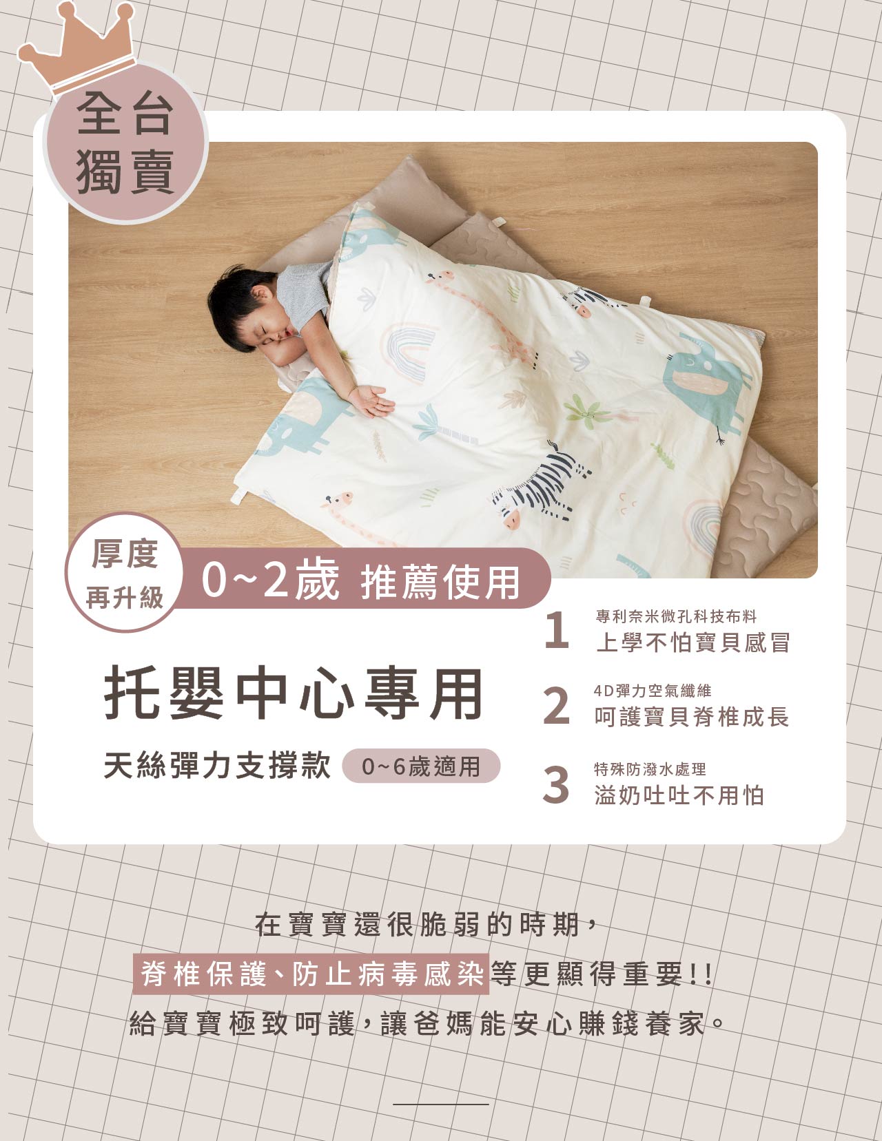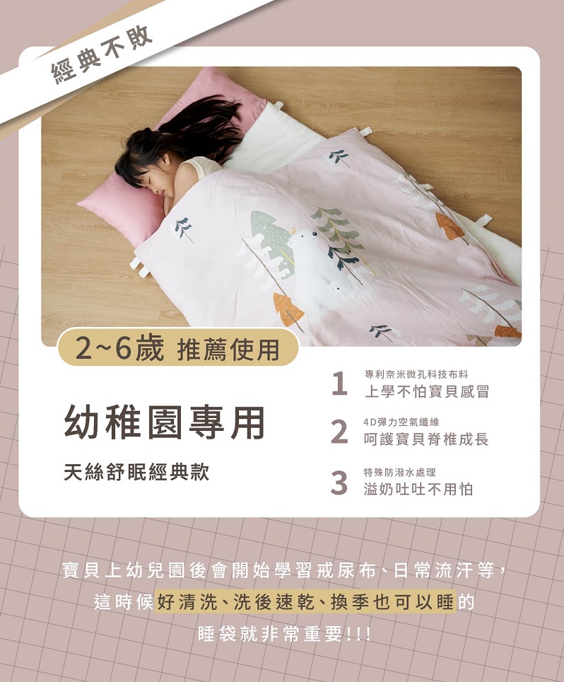 除了經典款睡袋以外,我們也設計了全台第一款0~2 歲的寶貝適合使用的天絲彈力支撐款兒童睡袋,