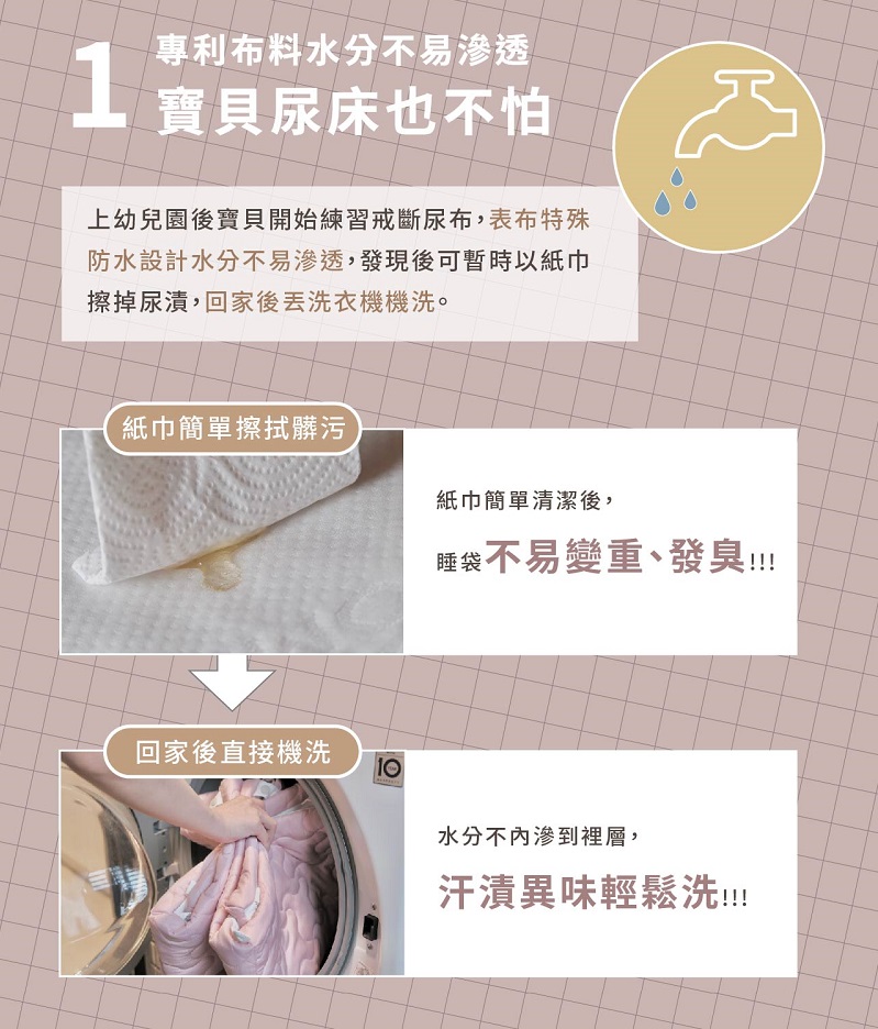 1. 專利防潑水抗菌、抗病毒、防蟎機能布料,寶貝尿床、溢奶不用怕