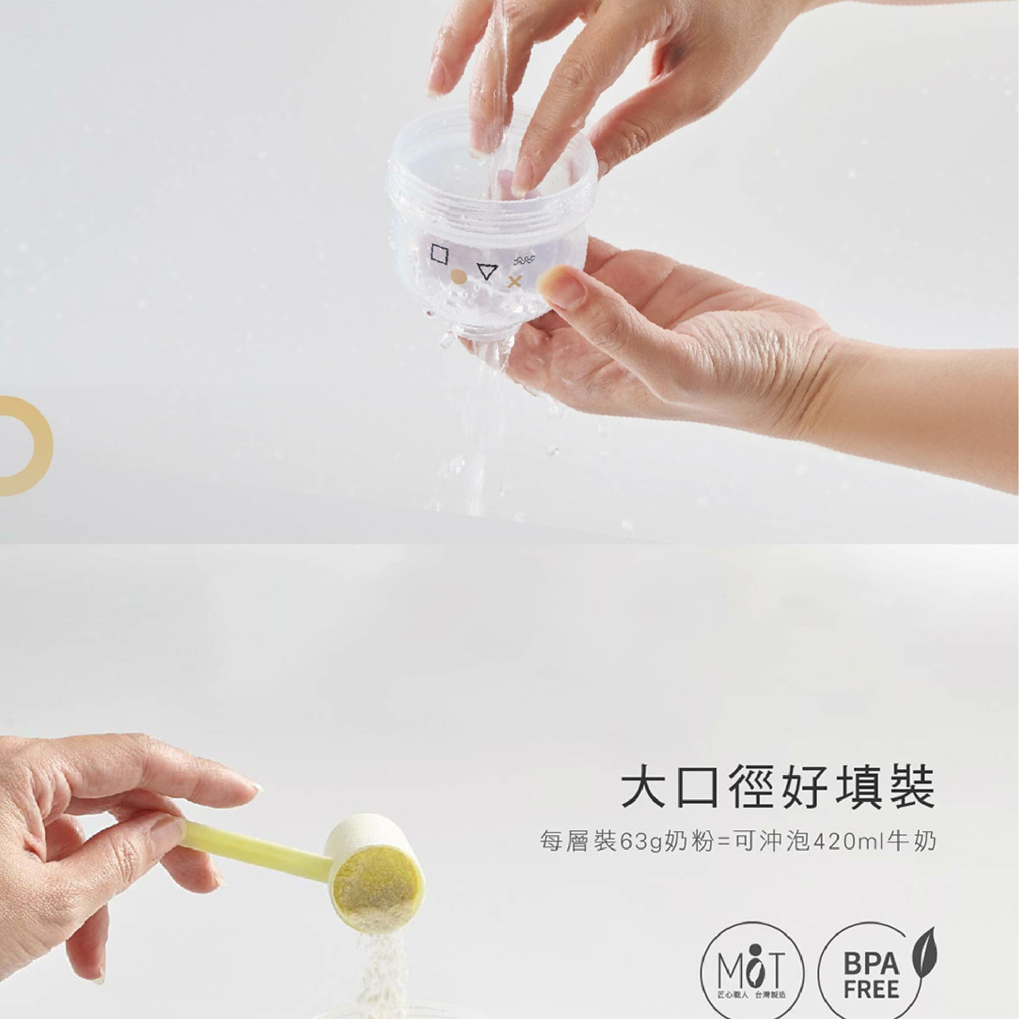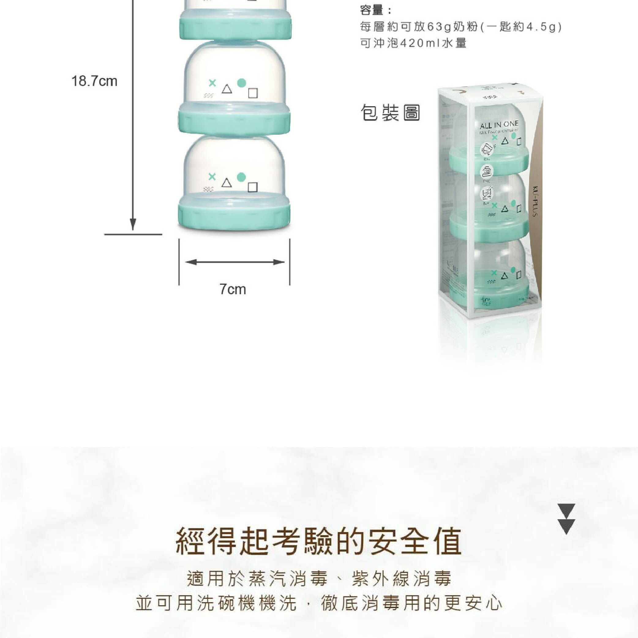 容量:每層約可放63g奶粉(一匙約4.5g),可沖泡420ml水量