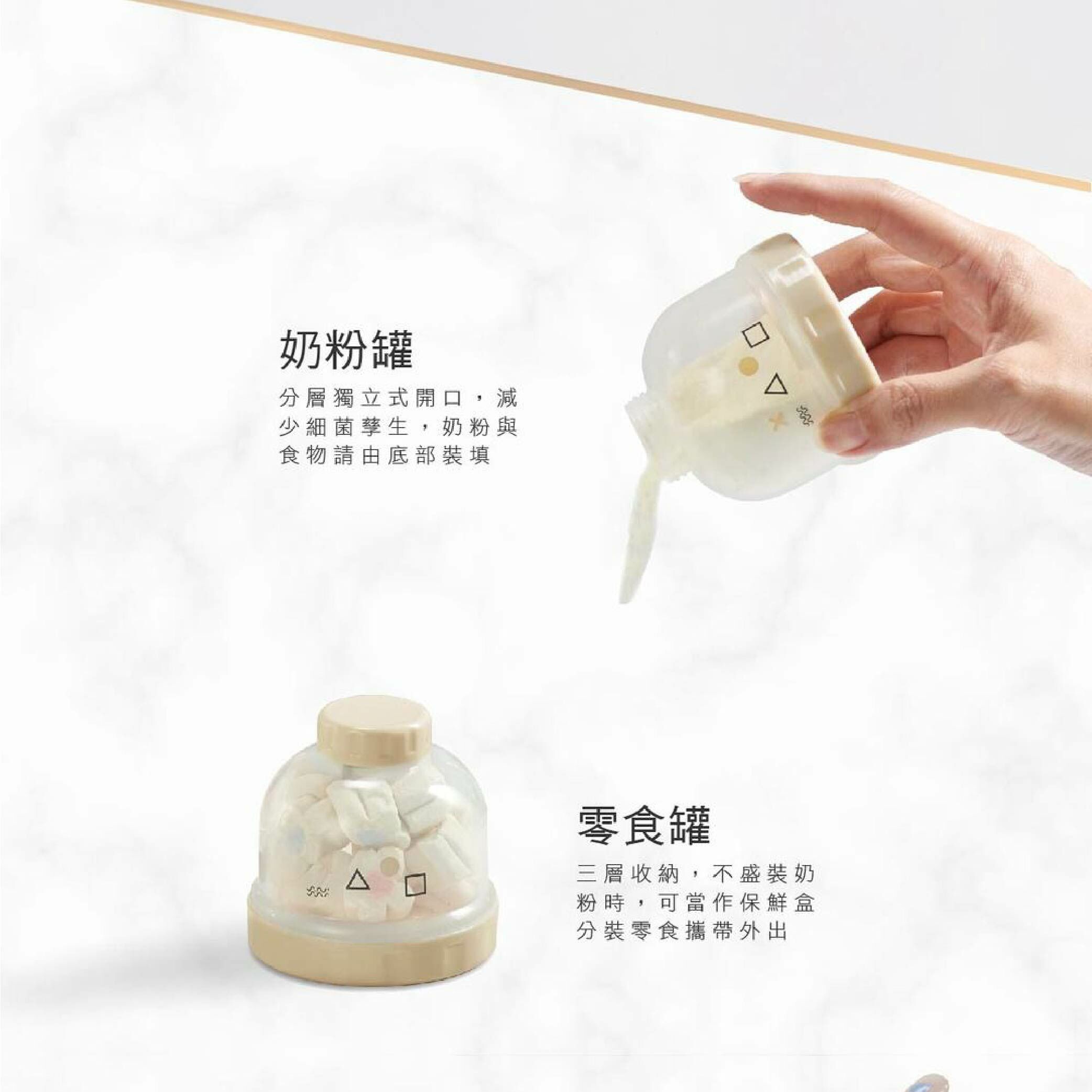 分層獨立式開口減少細菌孳生,清潔又衛生;奶粉與食物請由底部裝填,大口徑不易灑落更容易裝填。