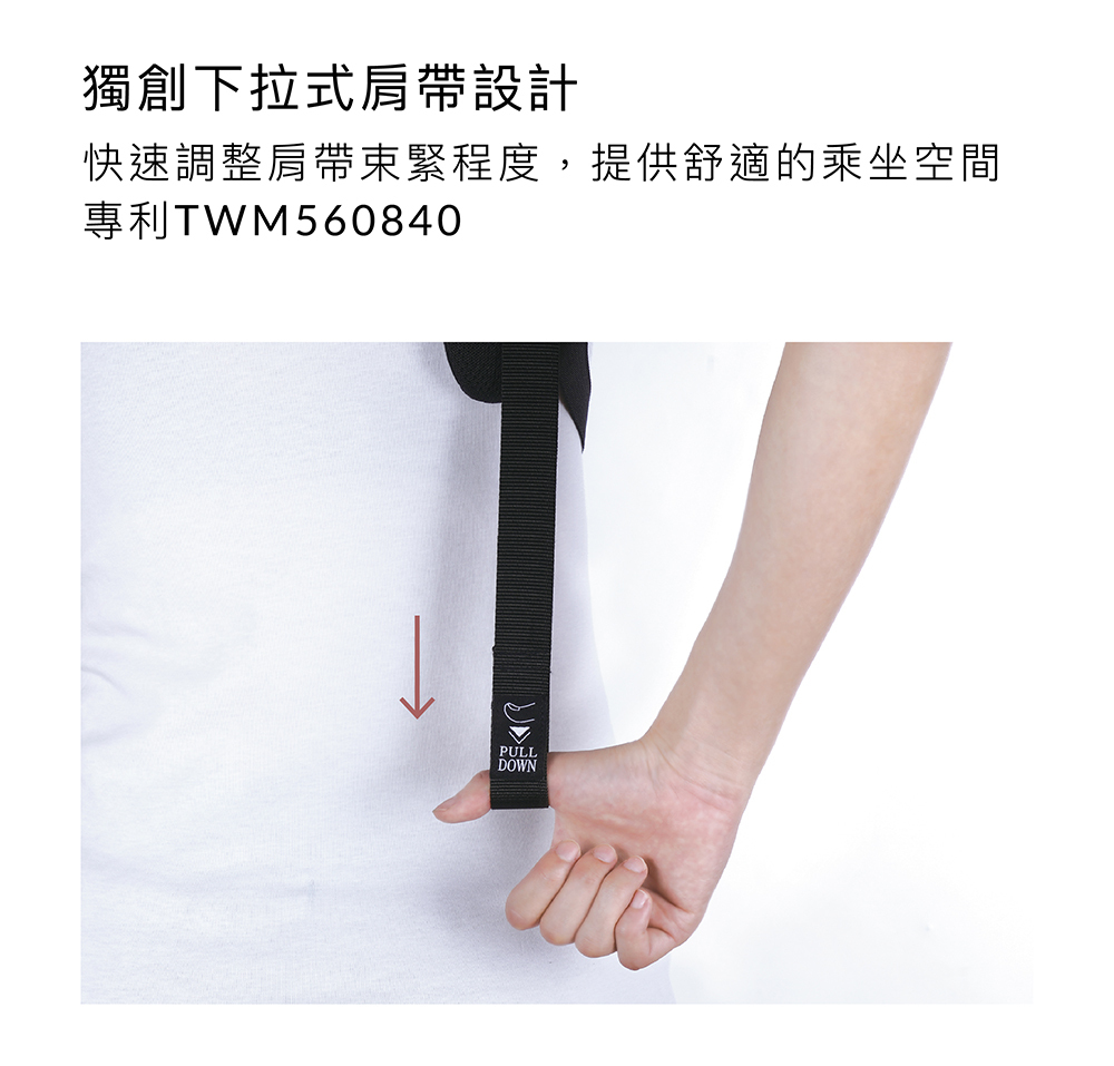 獨創下拉式肩帶設計 可快速調整肩帶束緊程度
