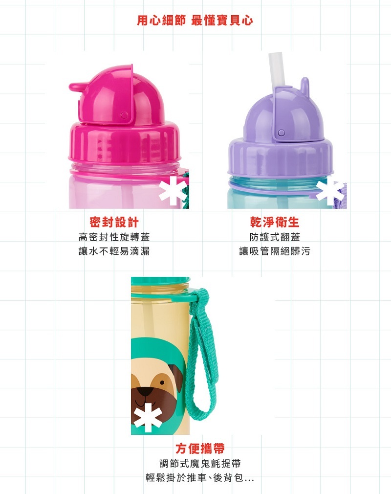 開合靈活的翻蓋設計,保持吸管乾淨衛生! 方便攜帶讓寶貝可隨時隨地補充水分。