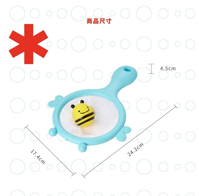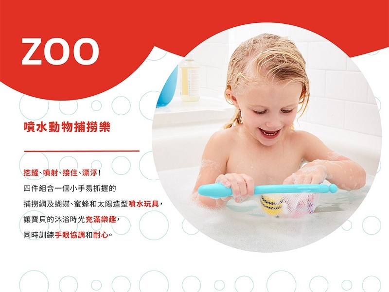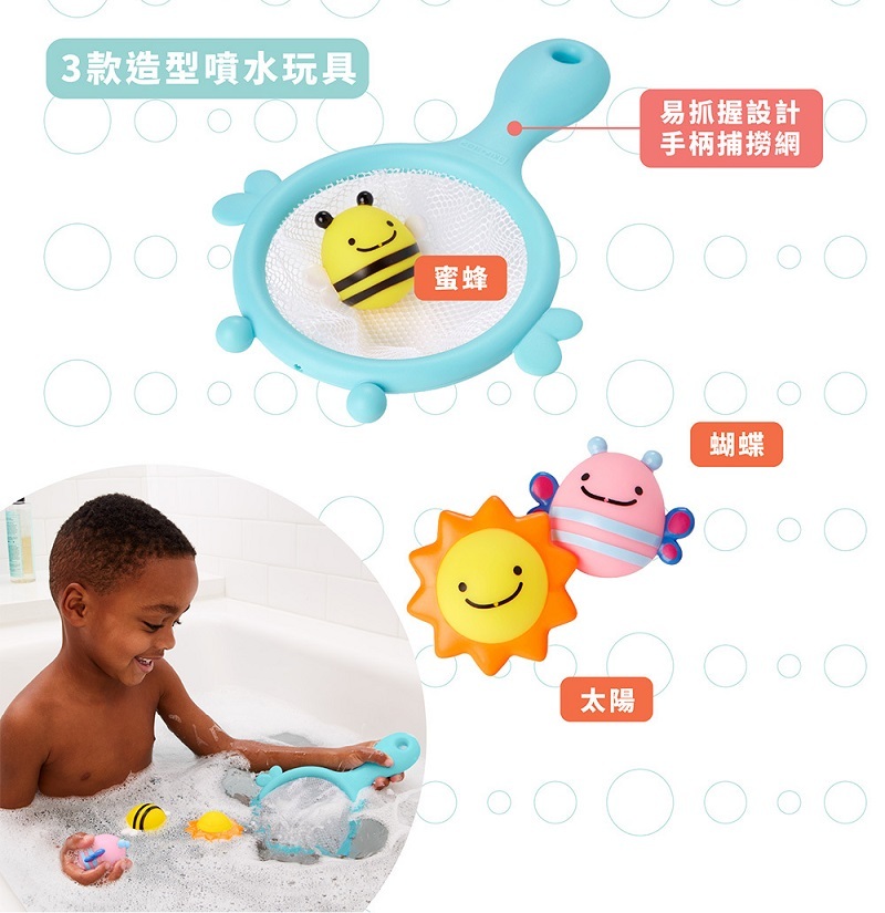 4件組含一個小手易抓握的捕撈網及用手擠壓時會噴出水的蝴蝶、蜜蜂和太陽3款造型噴水玩具,讓寶貝的沐浴時光充滿樂趣,同時訓練手眼協調和耐心。