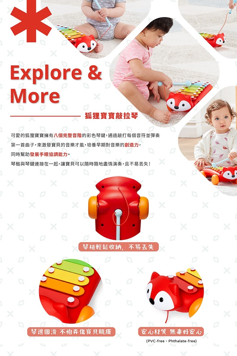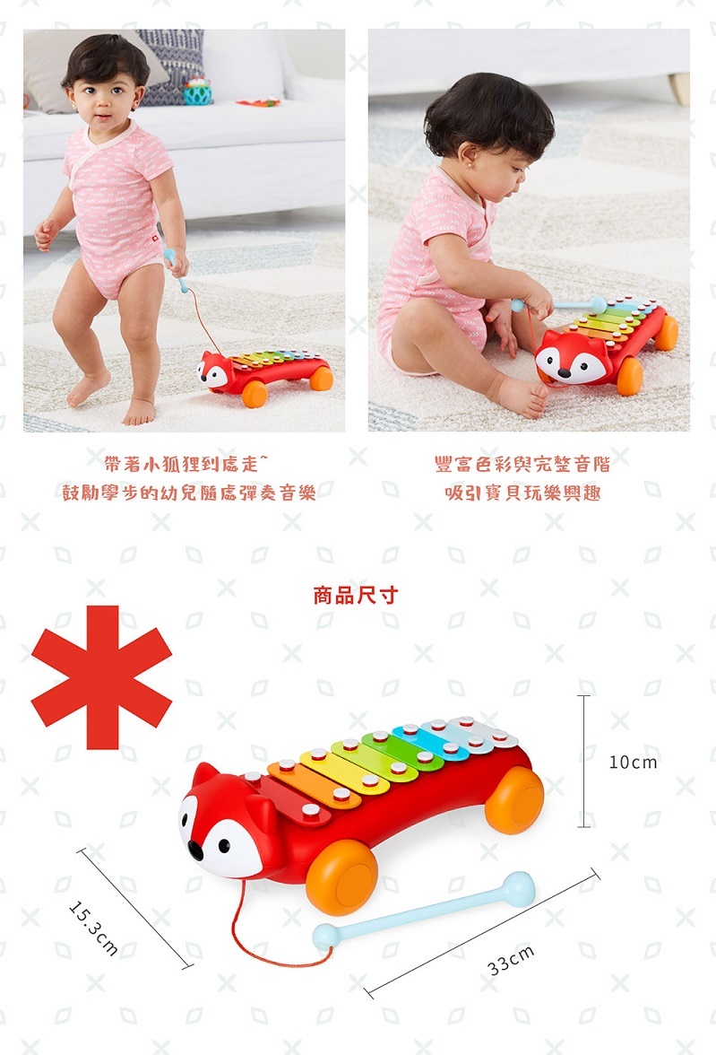 可愛的狐狸寶寶擁有八個完整音階的彩色琴鍵,通過敲打每個音符並彈奏第一首曲子,來發展寶貝的音樂才能,激發早期對音樂的創造力,同時幫助發展手眼協調能力。