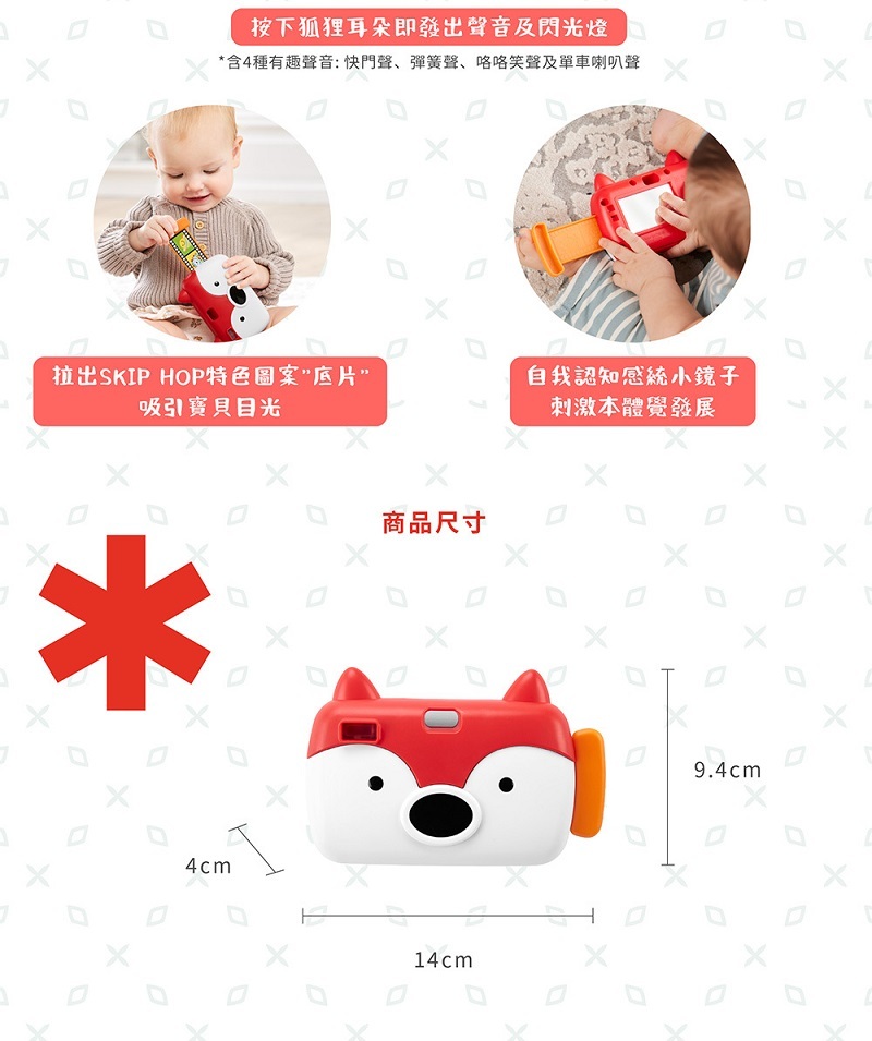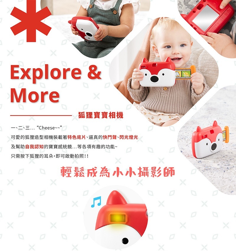 可愛的狐狸造型相機裝載著特色底片、逼真的快門聲音、閃光燈光及寶寶感統鏡…等各項有趣功能~