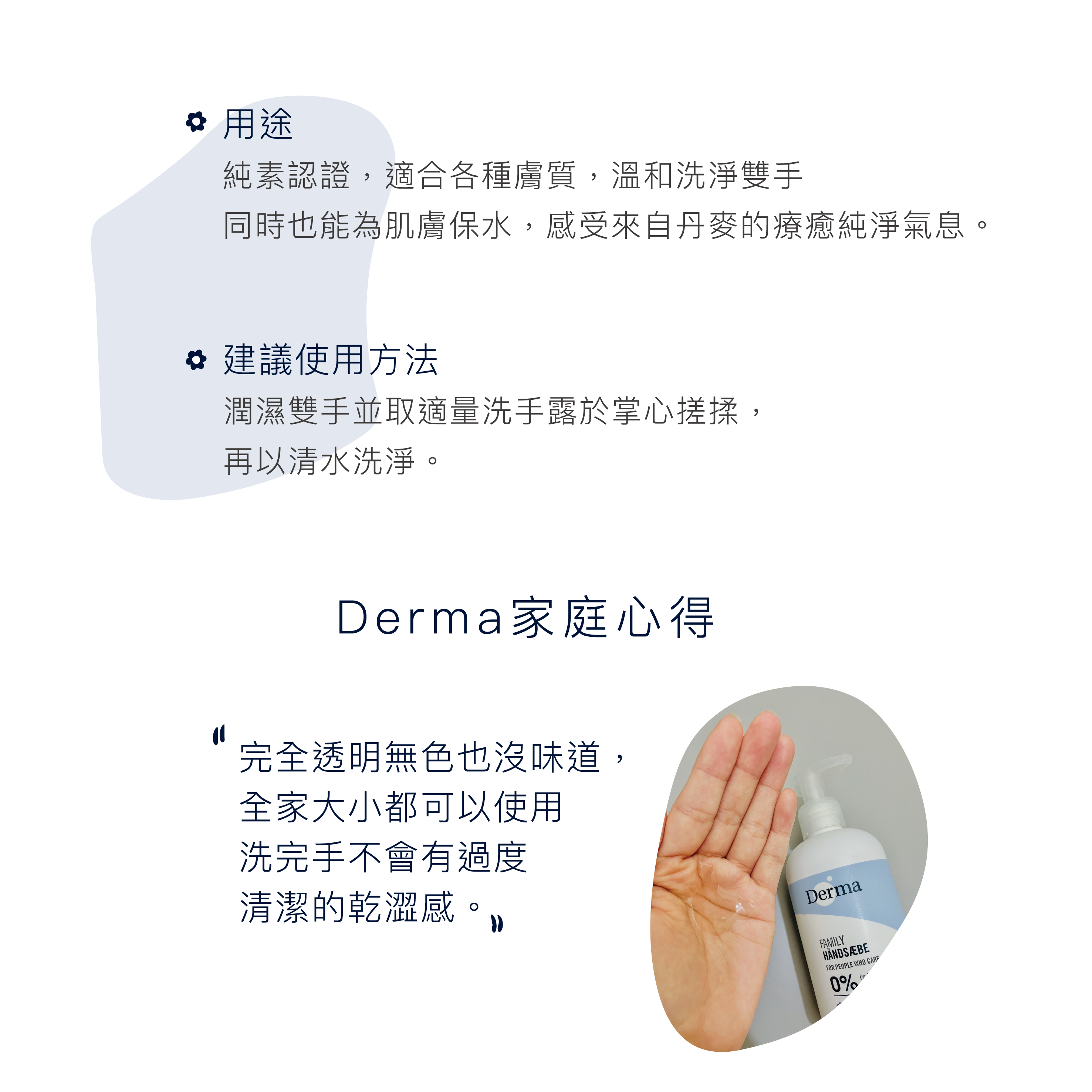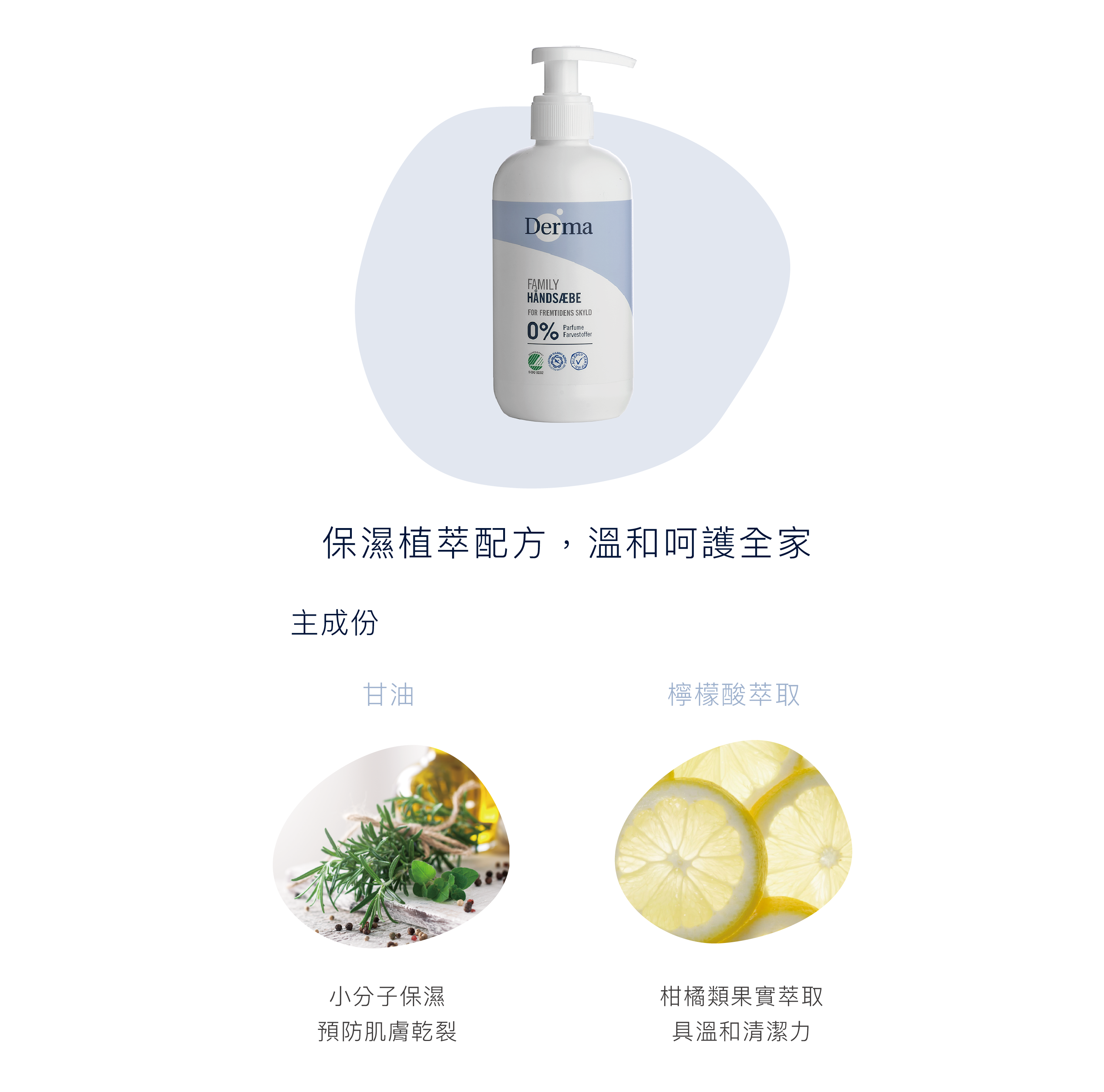 Derma家庭系列榮獲丹麥哮喘低敏協會及北歐人體低害與環保認證。無影響香料及酒精。來自天然保濕配方,洗後不乾澀。適合全家人使用。