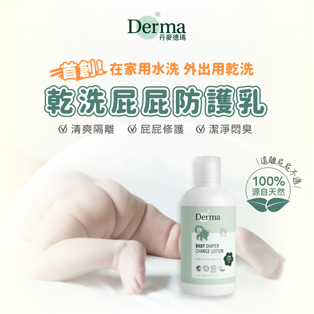 首創!「屁屁防護乾洗乳」,丹麥媽咪人手一瓶,解決外出不能水洗屁屁困擾,一抹完成清潔、隔離、保濕!有效清潔臭味、遠離屁屁不適,媽媽寶寶外出神隊友!