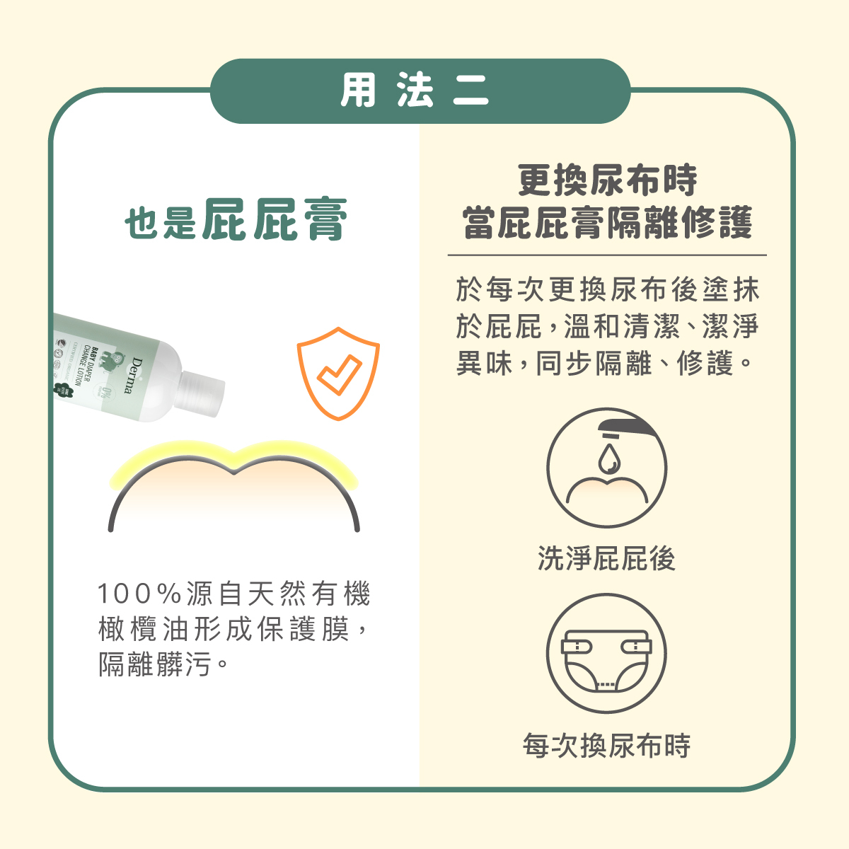 用法:先使用濕紙巾帶走便變髒汙;再將乾洗屁屁防護乳均勻搖晃,倒於乾溼巾或濕紙巾上,塗抹於寶寶屁屁同步完成清潔、隔離、修護。