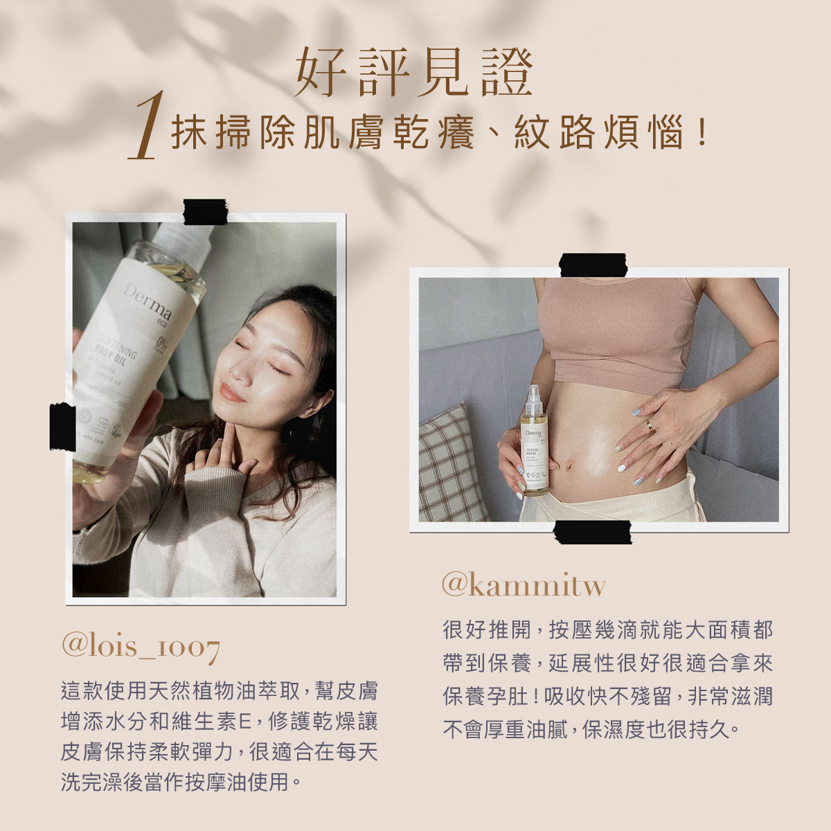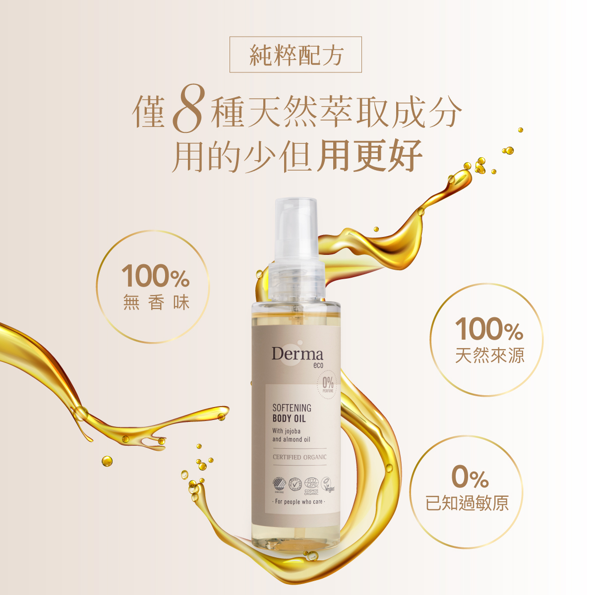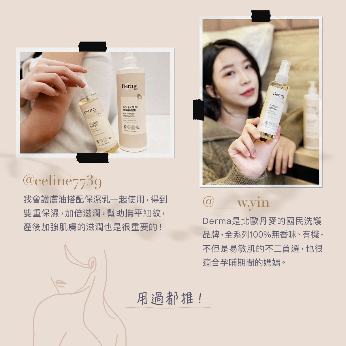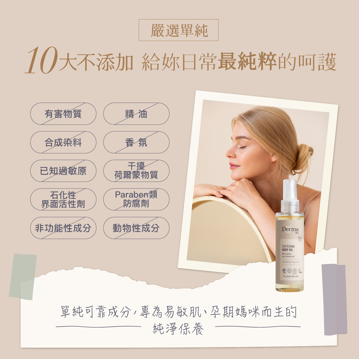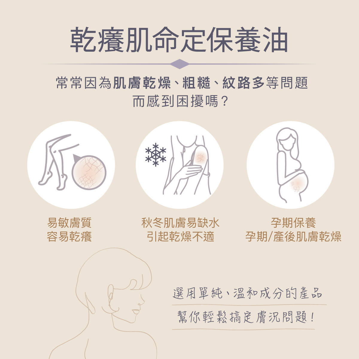 有機植物油複合配方成分溫和,舒緩乾燥,提升保水度,使肌膚潤澤有彈力。適合日常保養、舒壓按摩、妊娠護理、粗糙肌膚滋潤。產品拒絕動物實驗,友善環境,不使用動物延伸成分,肌膚保養,也能實現更美好的地球。