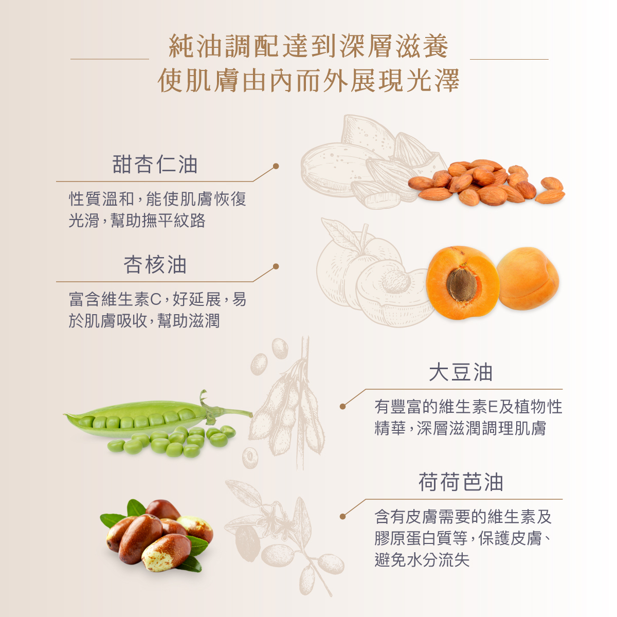 ・ 有機植物油複合配方,潤澤不粘膩,修護乾燥