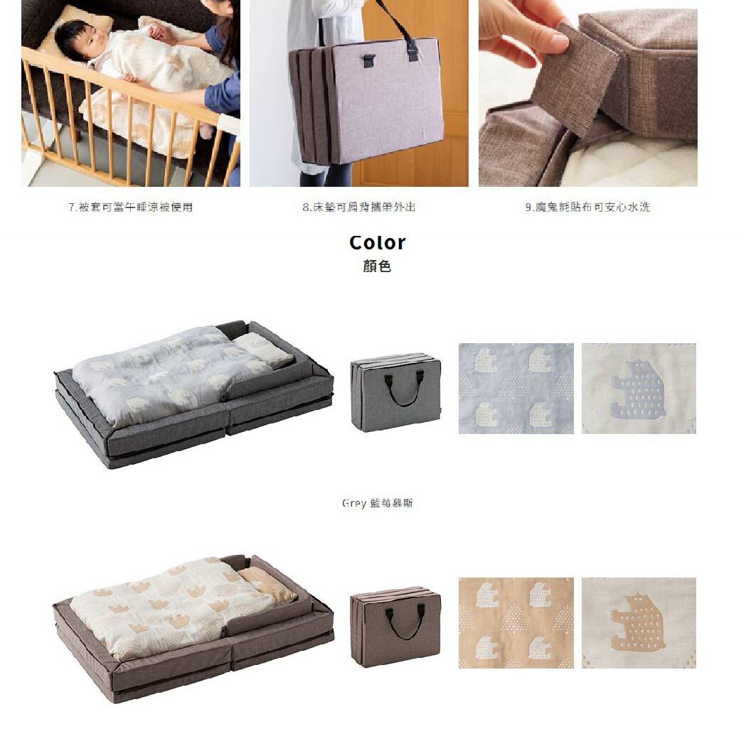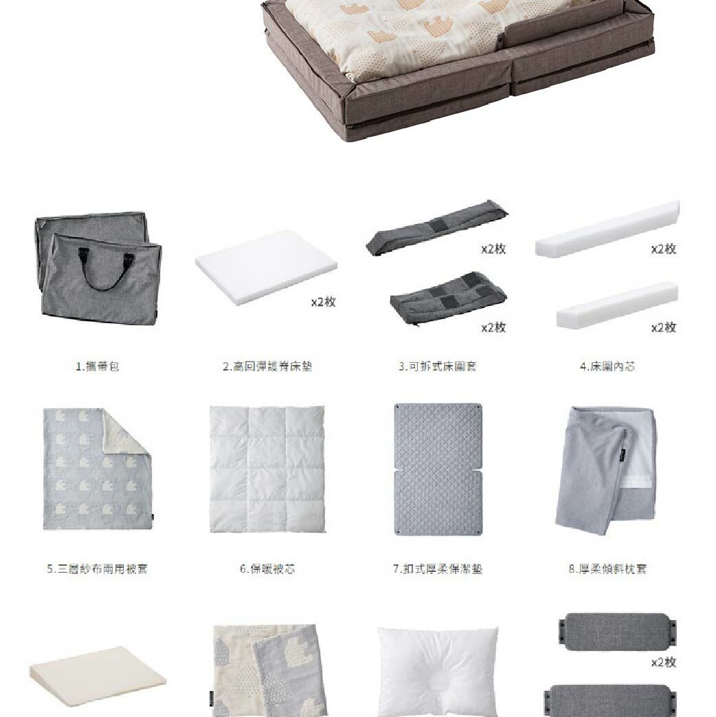 產品內容物:攜帶包、高回彈護脊床墊、可拆式床圍套、床圍內芯、三層紗布兩用被套、保暖被芯、扣式厚柔保潔墊、厚柔傾斜枕套、傾斜枕、三層紗枕頭套、枕芯、可拆式護頭欄、魔鬼氈貼布