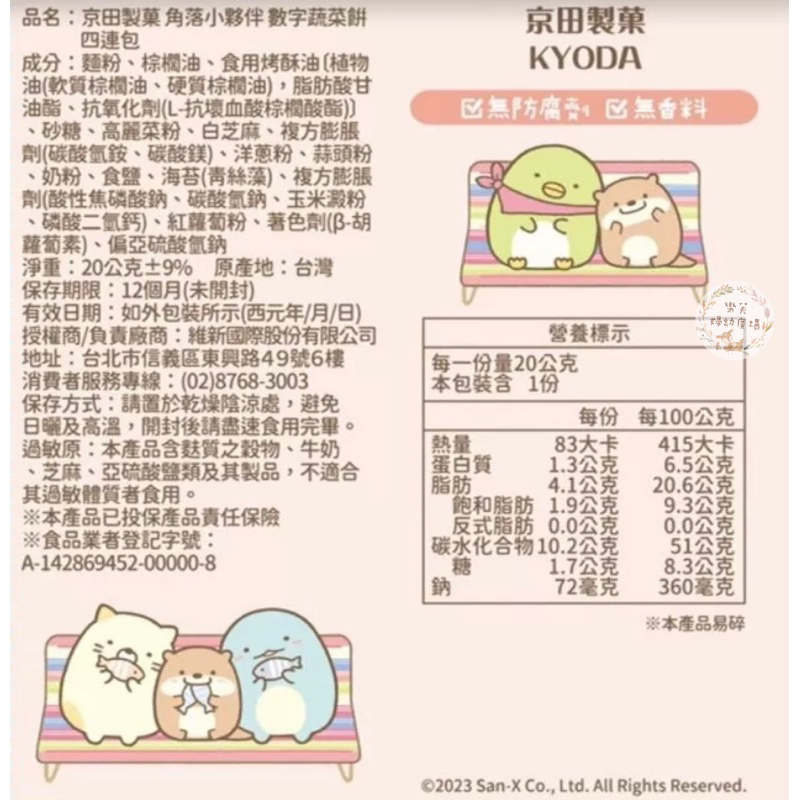 .品名:【京田製菓】角落小夥伴 數字蔬菜餅四連包