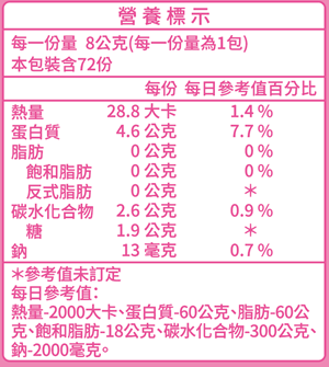 成份:魚鱗膠原蛋白粉末(含高濃度PO.OG膠原蛋白)、青蘋果果汁粉(砂糖、蘋果果汁粉、辛烯基丁二酸鈉澱粉、檸檬酸、玉米澱粉、蘋果酸、蘋果香料粉、檸檬酸鈉、焦糖色素)、果糖粉、檸檬果汁粉(砂糖、檸檬果汁粉、辛烯基丁二酸鈉澱粉、檸檬酸、檸檬酸鈉、蘋果酸、玉米澱粉、檸檬香料粉、焦糖色素)、綜合果汁粉(砂糖、綜合果汁(柳橙、鳳梨、百香果、芒果、甜橙、檸檬)、檸檬酸、綜合水果香料、檸檬酸鈉、蘋果酸、玉米澱粉、β-胡蘿蔔素)、維生素C、無水檸檬酸、青蘋果香料粉、胺基乙酸、蔗糖素(甜味劑)、D-核糖、L-半胱胺酸鹽酸鹽、珍珠粉、木寡糖、孢子型乳酸菌LACRIS®-S(乳糖、孢子型乳酸菌)、雞冠萃取物(含玻尿酸鈉)、蒟蒻抽取物(含賽洛美)。