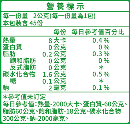 成份:葡萄糖、初胚燕麥粉(初胚熟化燕麥粉、麥芽提取物、燕麥糠提取物、非氫化椰子油、葵花卵磷脂、亞麻仁籽、葡萄糖、紅褐藻萃取物(含鈣)、海鹽)、 DHA藻粉(含專利微藻DHA)、乳脂粉、香草香料、磷脂醯絲胺酸(黃豆萃取物、二氧化矽)、金盞花萃取物(含葉黃素)、山桑子萃取物、卵磷脂。